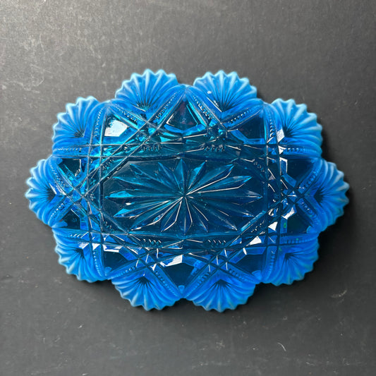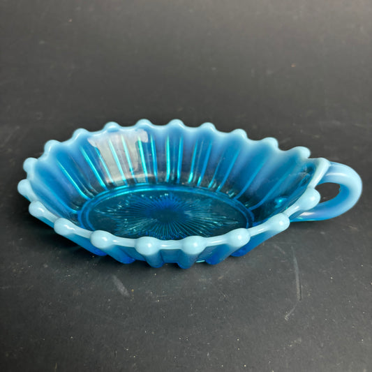Vintage Blue Glass Trinket Dish with Milk Glass Frill Edge