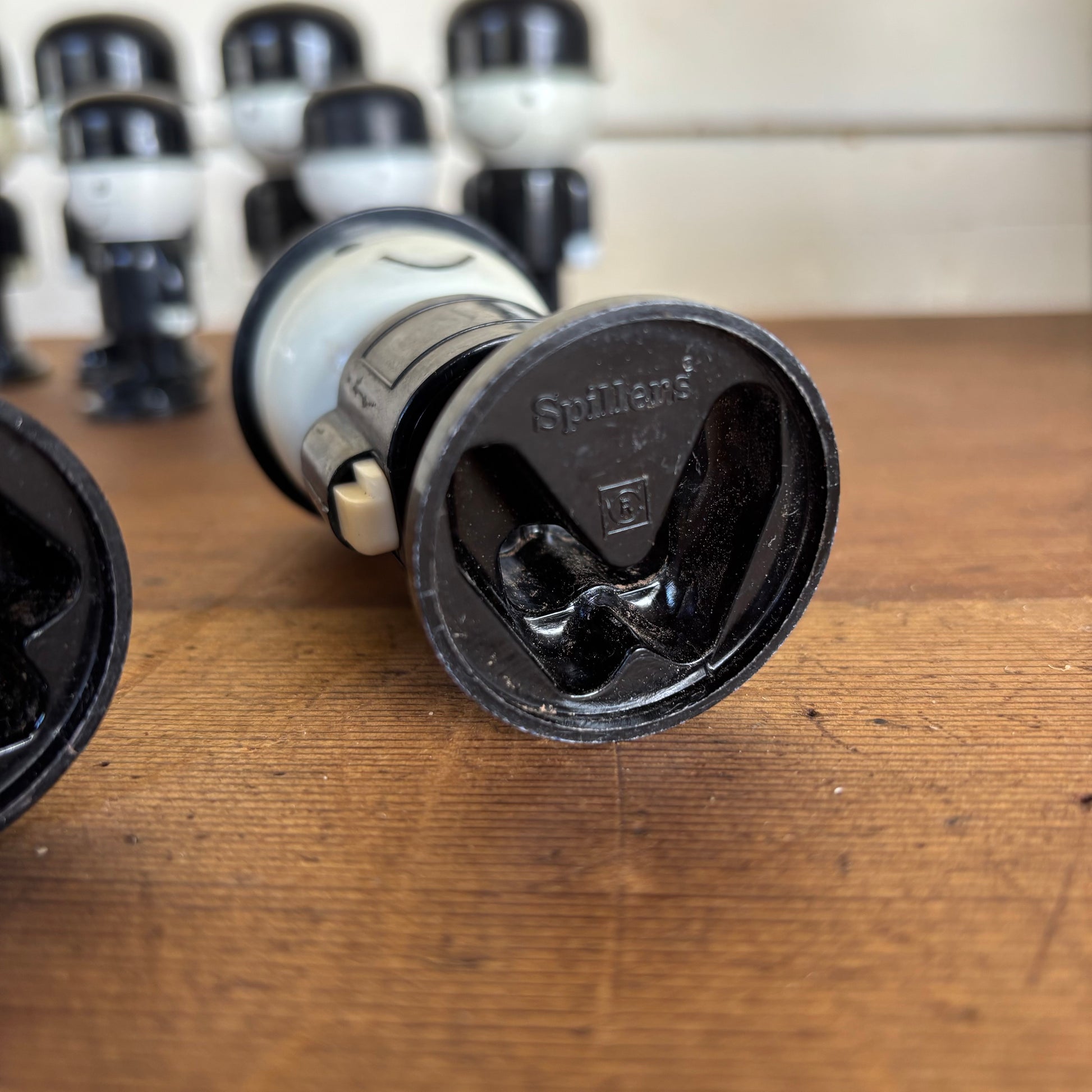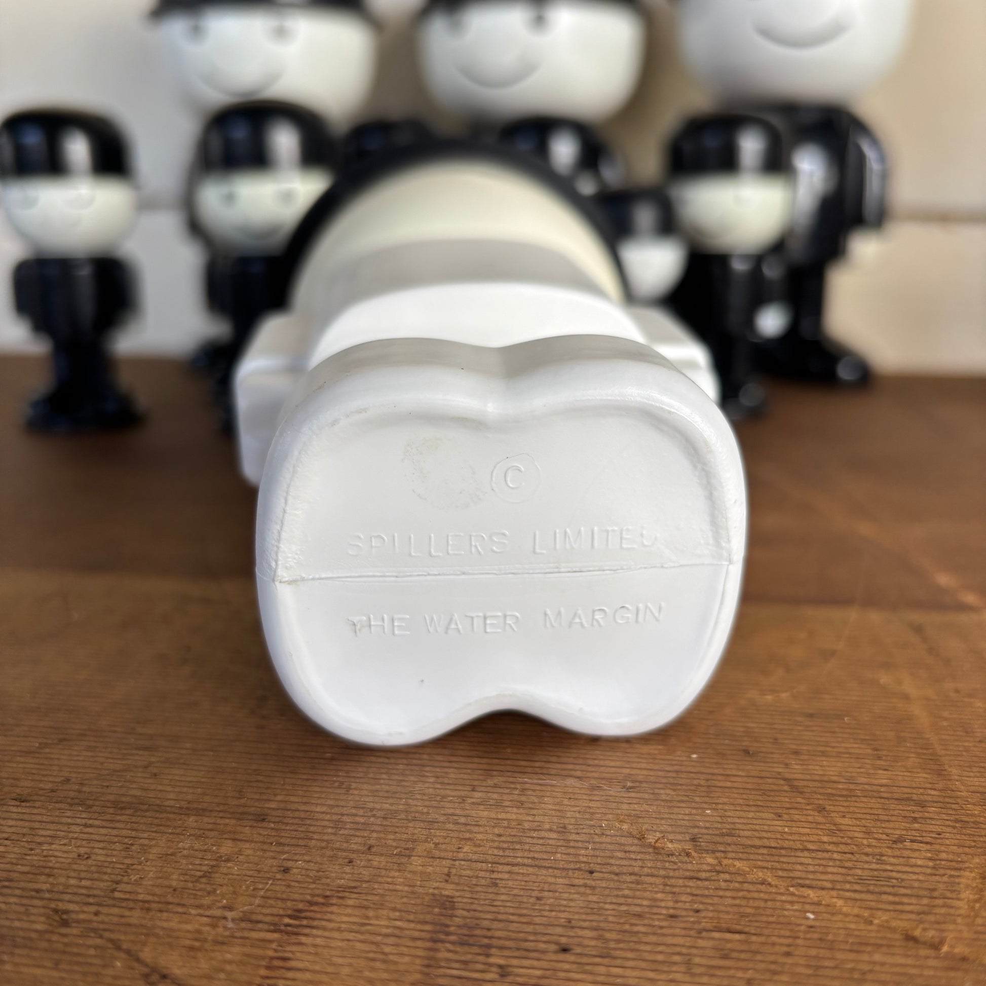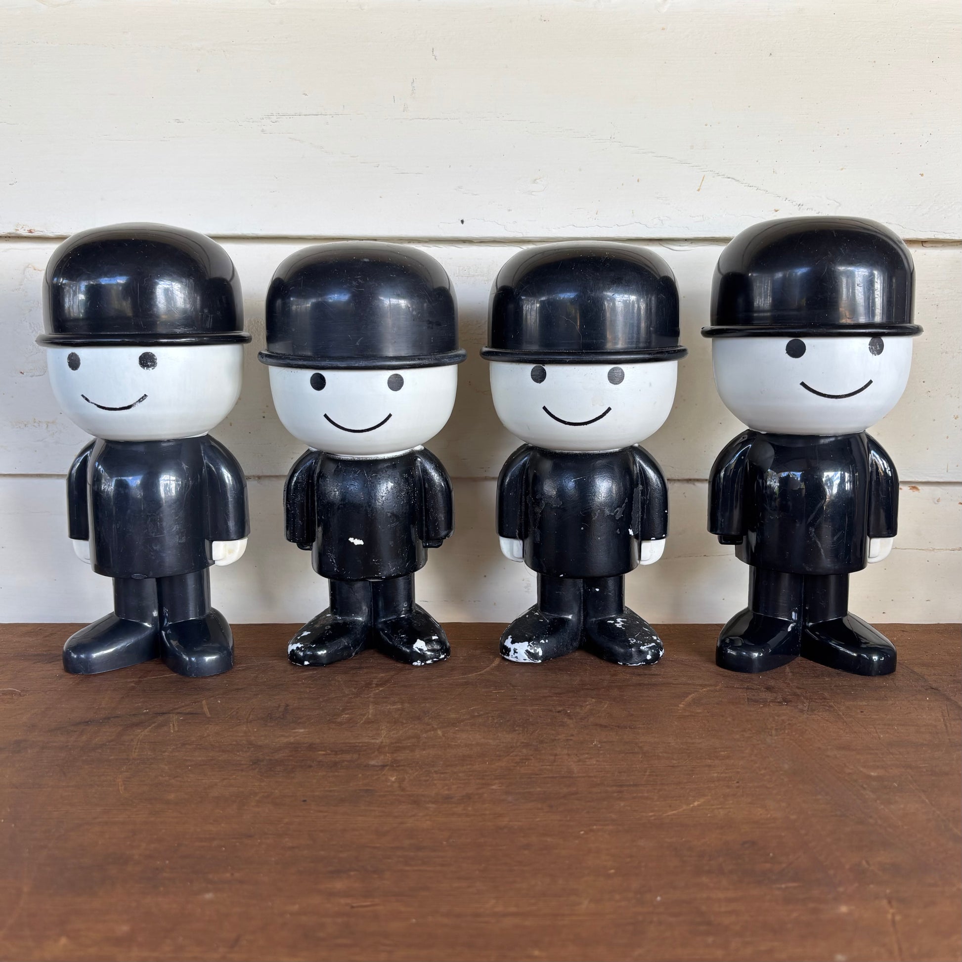 Cheerful vintage promotional figures produced for Spillers (UK) in the 1960s by Flair Plastics, originally used as salt, pepper and condiment shakers in-store. Sold here as a decorative display collection, this lot includes both genuine vintage pieces and two later reproductions for visual impact.
