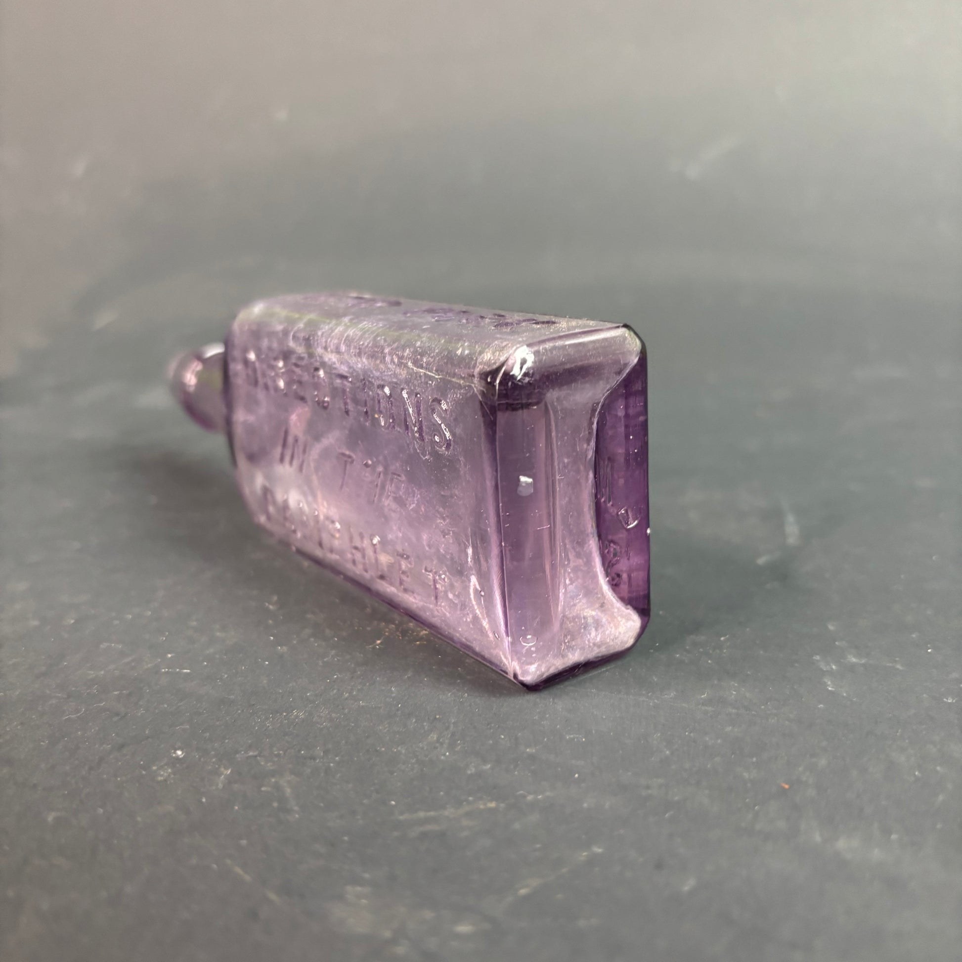 Originally a medicinal product, these bottles were deliberately shaped for tactile recognition. The strong purple tone and honest wear give it real shelf presence.