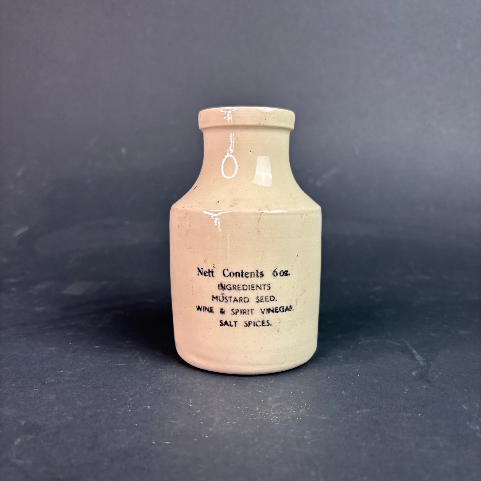 A classic English advertising mustard pot with plenty of presence on the shelf. This small stoneware jar once held “La Favorite” superfine mustard, made in London and supplied by Continental Comestibles Ltd. The crisp black transfer print and warm cream glaze give it that proper pantry aesthetic.