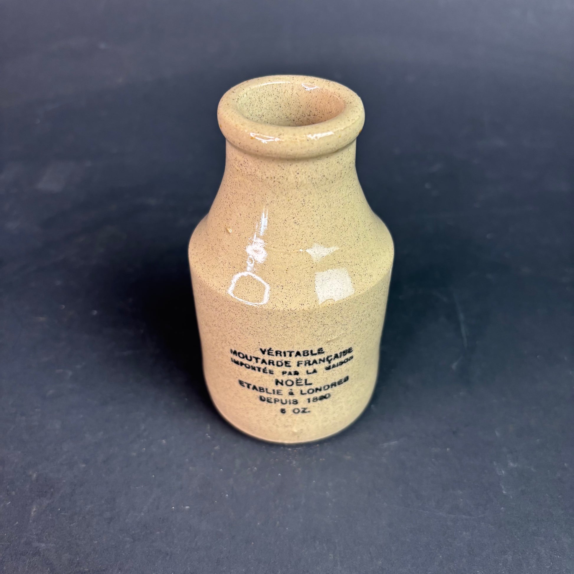 A sharp English-made stoneware mustard pot with bold French branding. Marked “Véritable Moutarde Française” and imported by the house of Noël, established in London, this piece sits right in that sweet spot between pantry ware and advertising collectable.