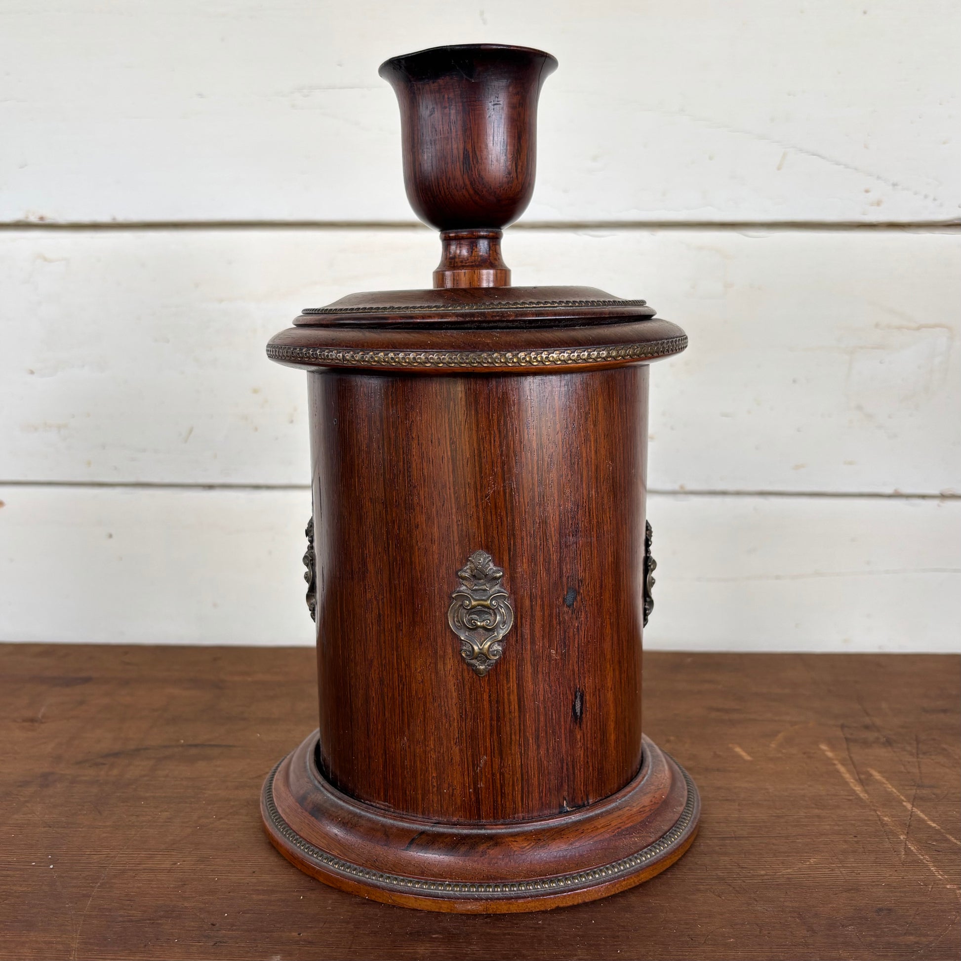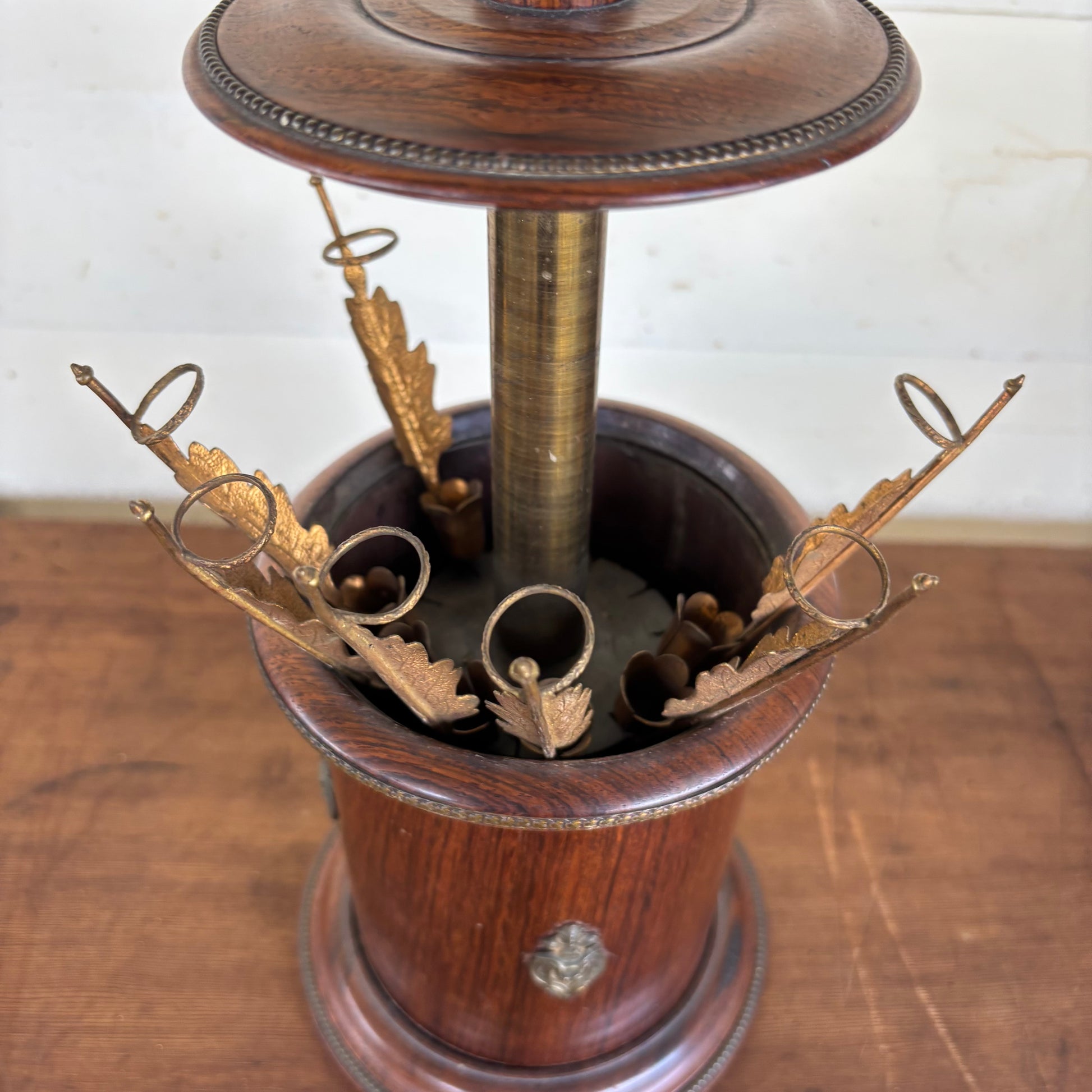 A beautifully crafted late Victorian–early Edwardian mahogany cigar holder, complete with original brass cigar piercers arranged around a central column and concealed by a finely turned lid.
