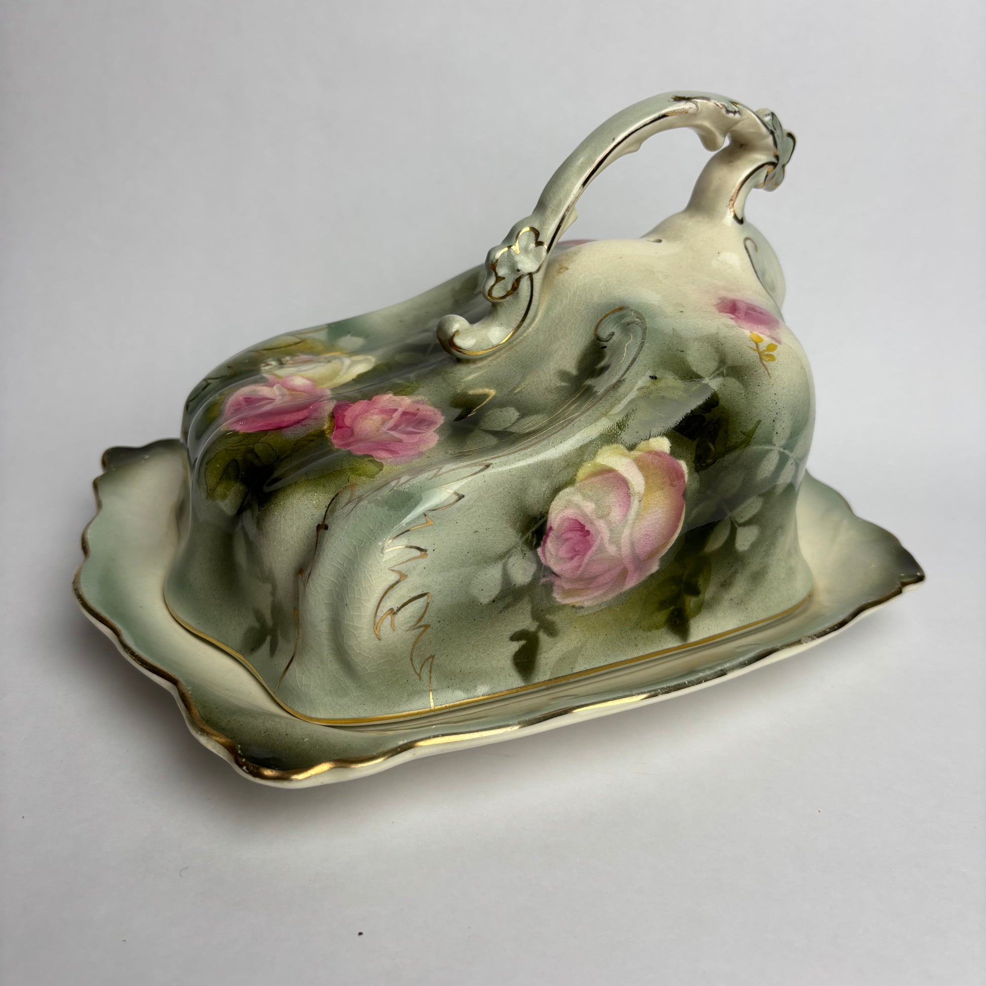 The softly moulded form is decorated with hand-painted roses and foliage, finished in gentle celadon-green shading with fine gilt edging and scrollwork. The arched handle is enriched with applied floral detailing — a hallmark of early Milford decorative wares.