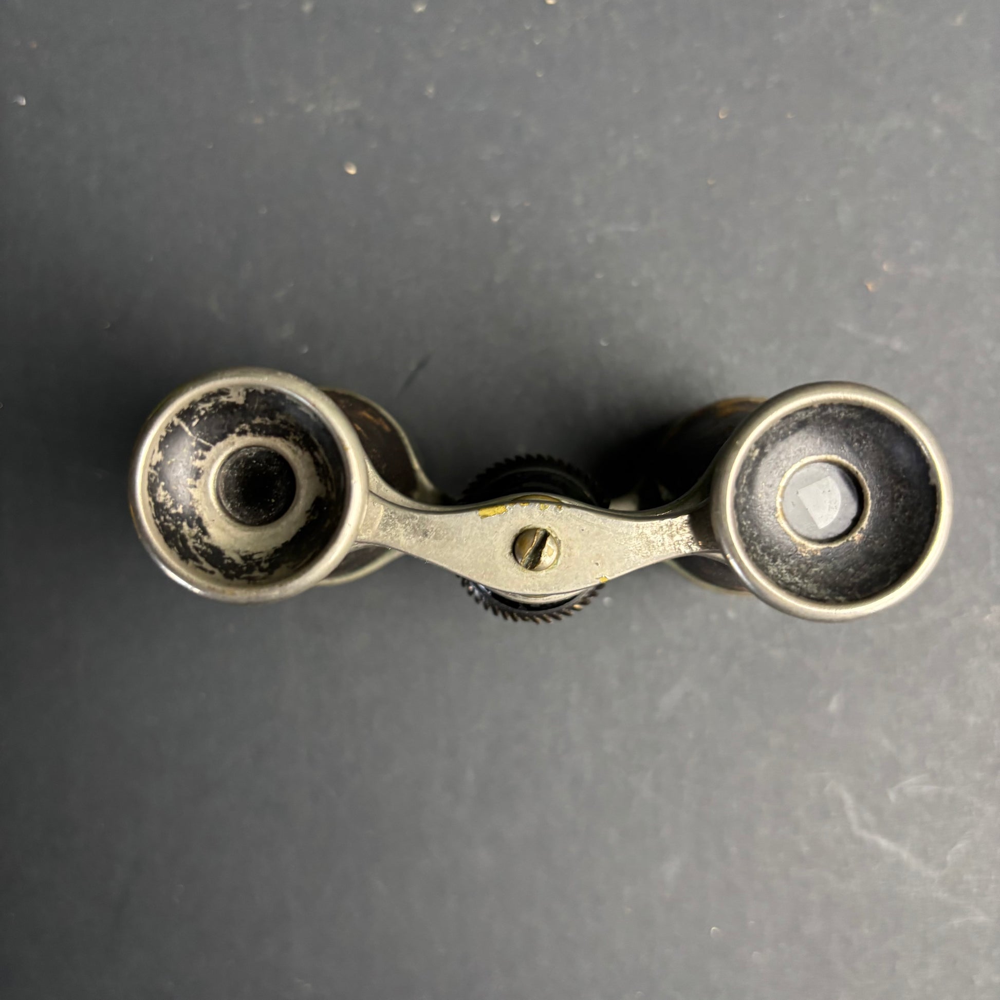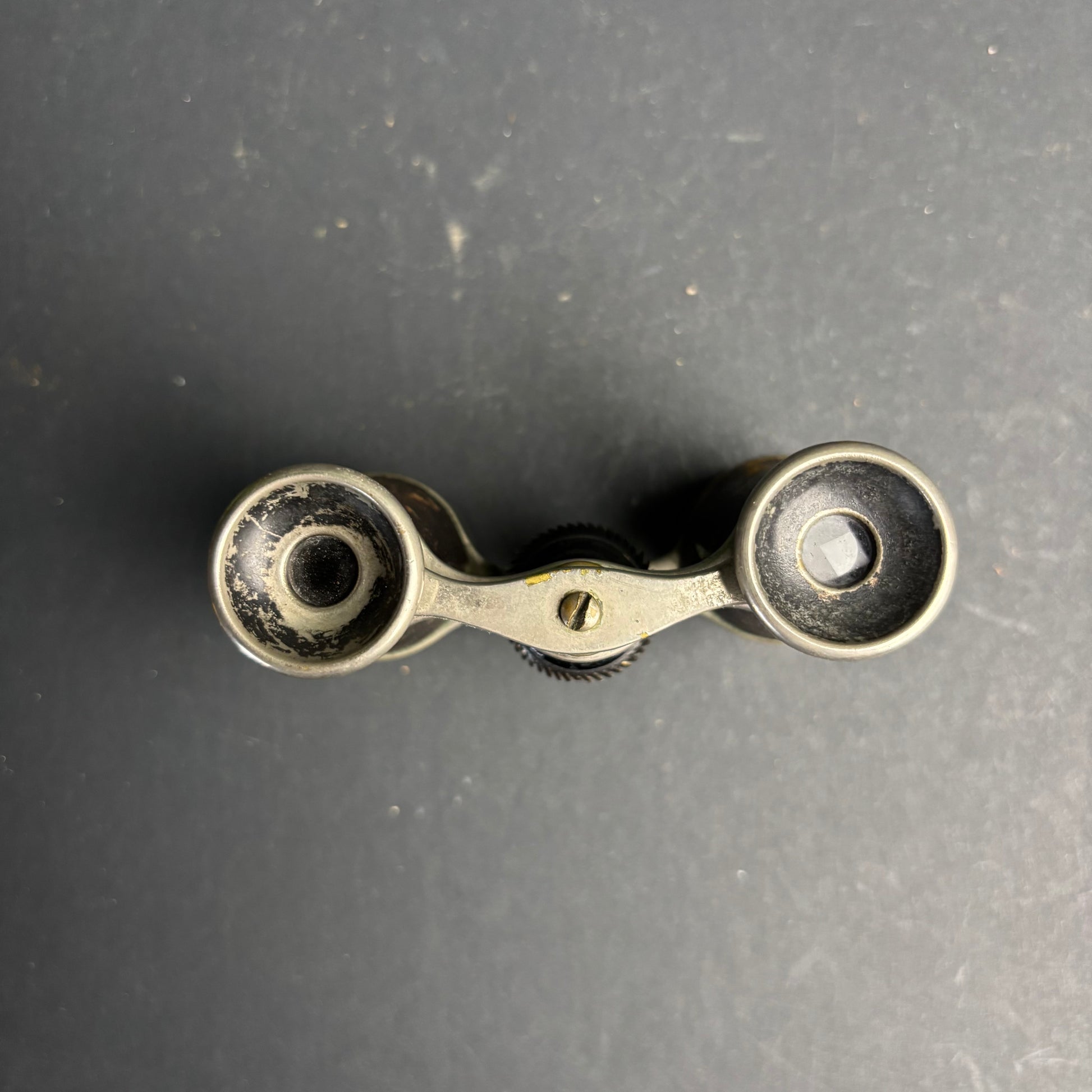 A fascinating pair of antique opera glasses featuring a built-in compass set into the bridge — a charming nod to travel and navigation from a bygone era.