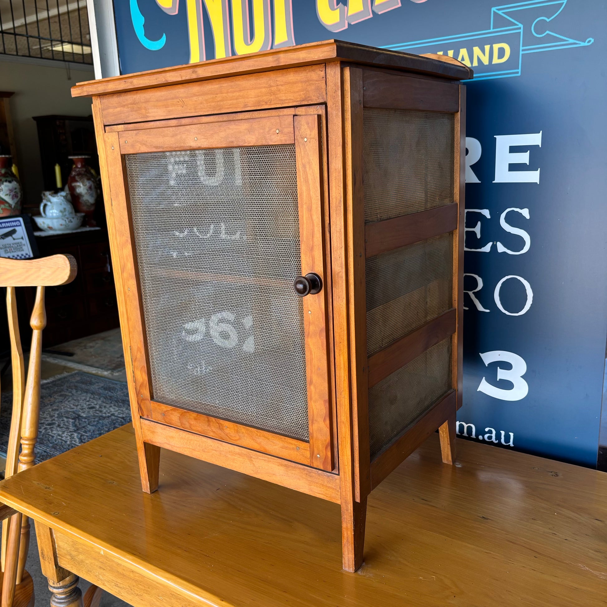 A genuine antique pine meat safe, also known as a Coolgardie safe—an iconic piece of early Australian domestic life.