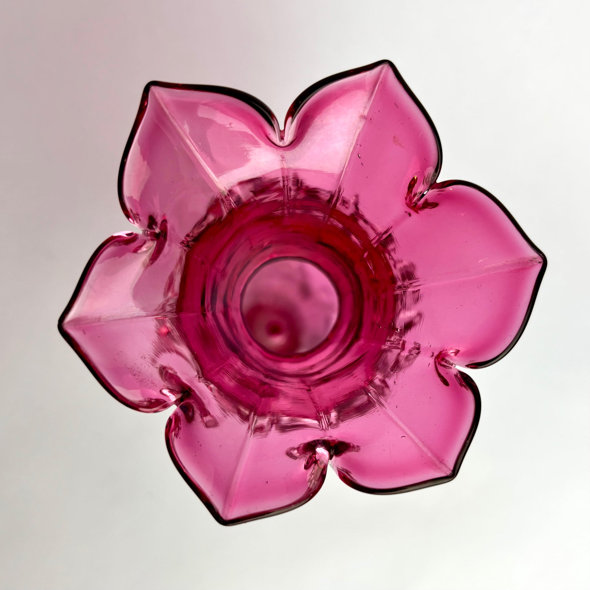 The cranberry colour is rich and even, with visible hand-working throughout and a polished pontil to the base. A classic decorative form from the late Victorian to Edwardian period, equally at home in a period interior or as a bold accent piece.