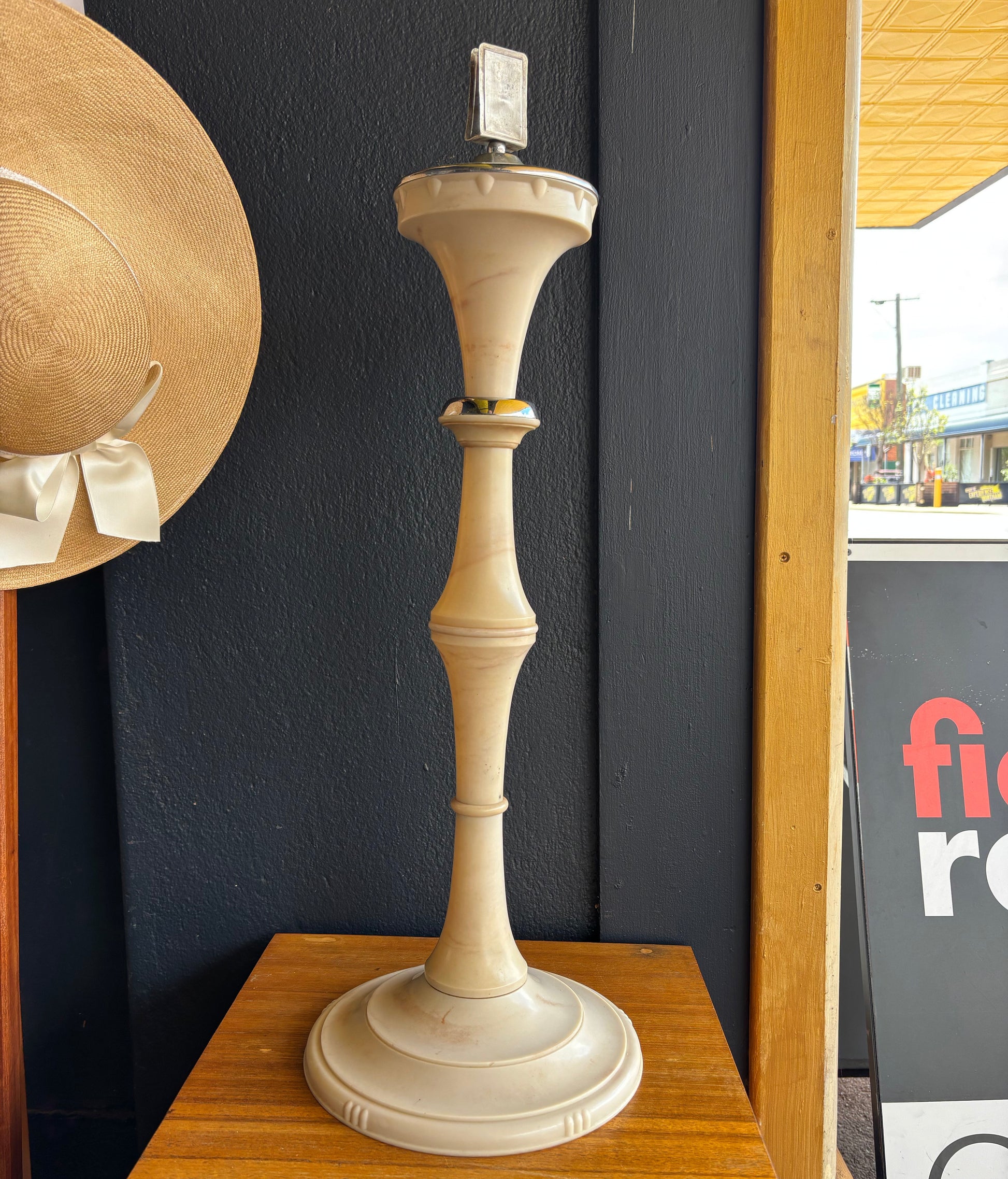 A sculptural cream-marbled Bakelite ashtray stand, circa 1930s–1950s, featuring an elegant fluted column and stepped base in the streamlined Art Deco style.