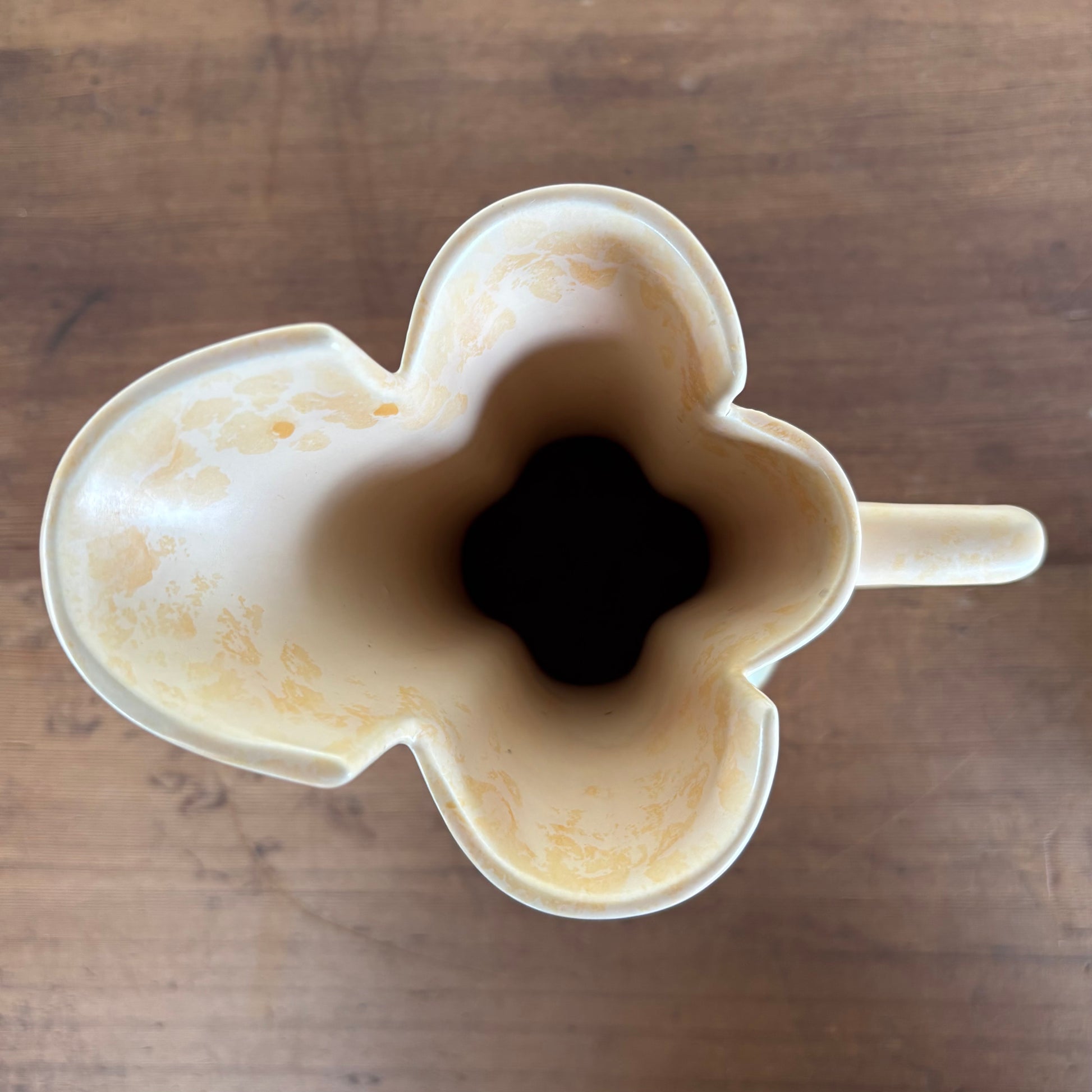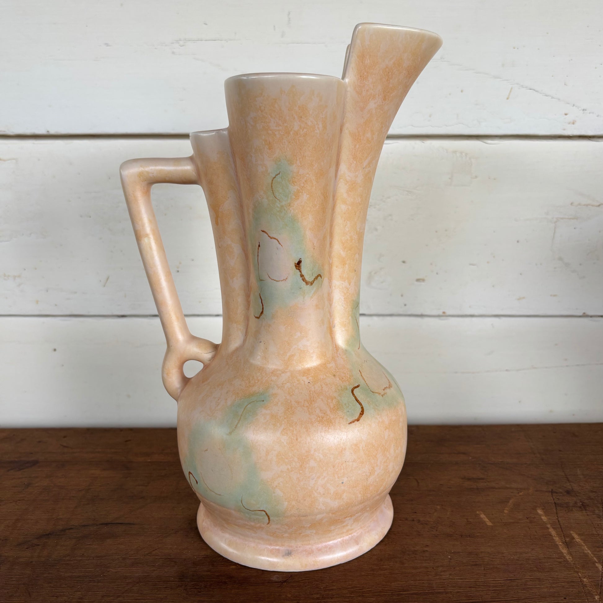A scarce and highly sculptural original Beswick Art Deco vase, circa 1940s, featuring dual tapered spouts and angular handle. Finished in marbled peach and pale eucalyptus-green glaze with classic age-related crazing.