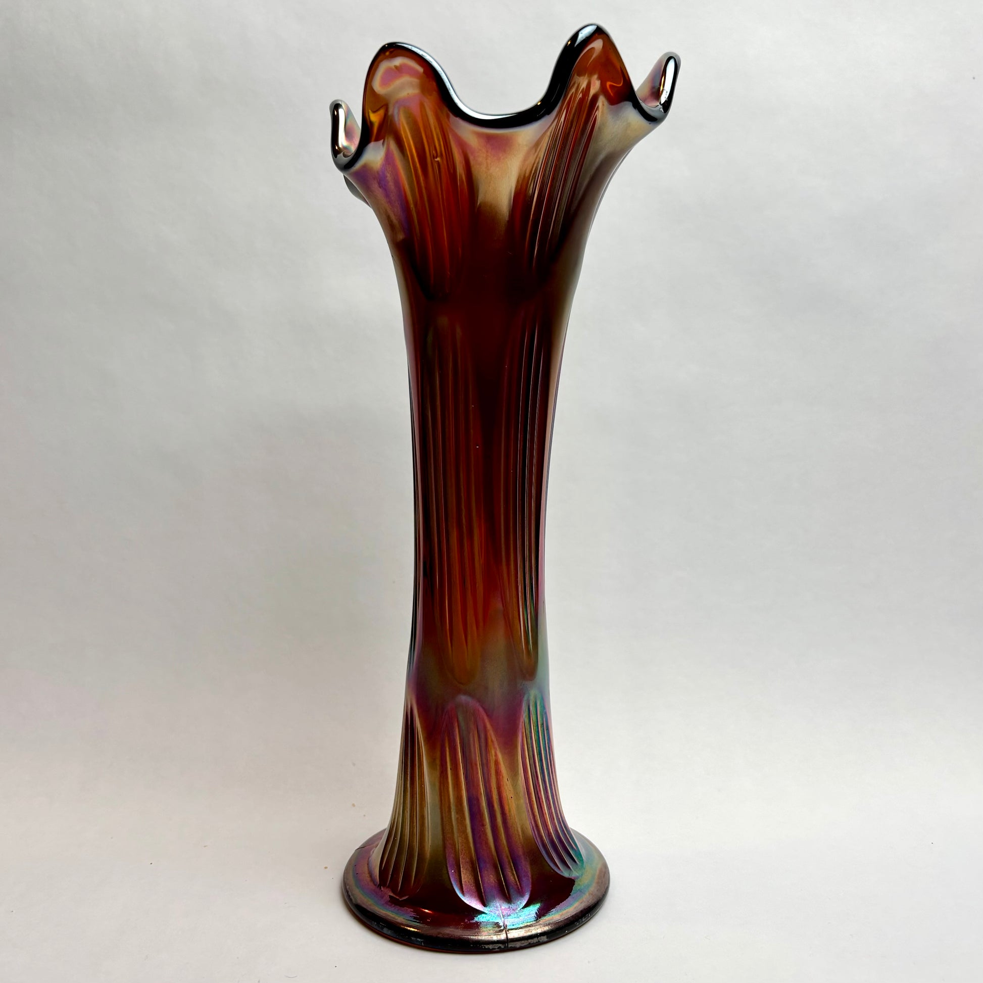 The body displays moulded vertical rib detailing, catching the light with shifting tones of gold, copper, violet and green depending on angle. The classic trumpet silhouette and luminous finish make this a strong decorative piece, whether styled alone or displayed with other art glass.