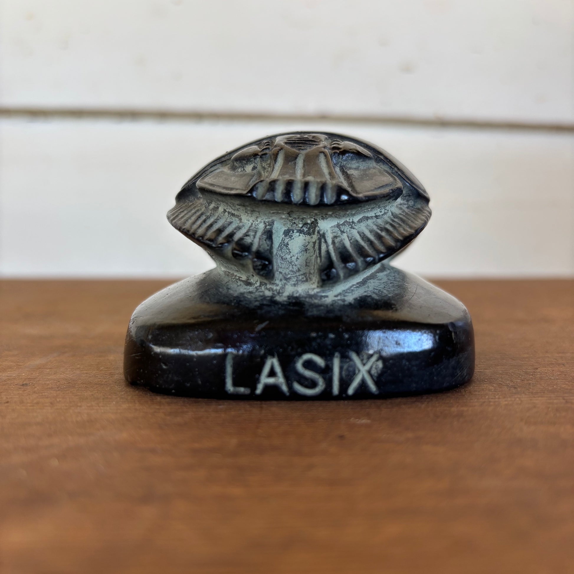 The piece is finished in a dark blackened tone with lighter rubbed highlights, giving strong contrast to the carved detailing. The underside features multiple lines of hieroglyph-style symbols, while the front base is marked “LASIX”.