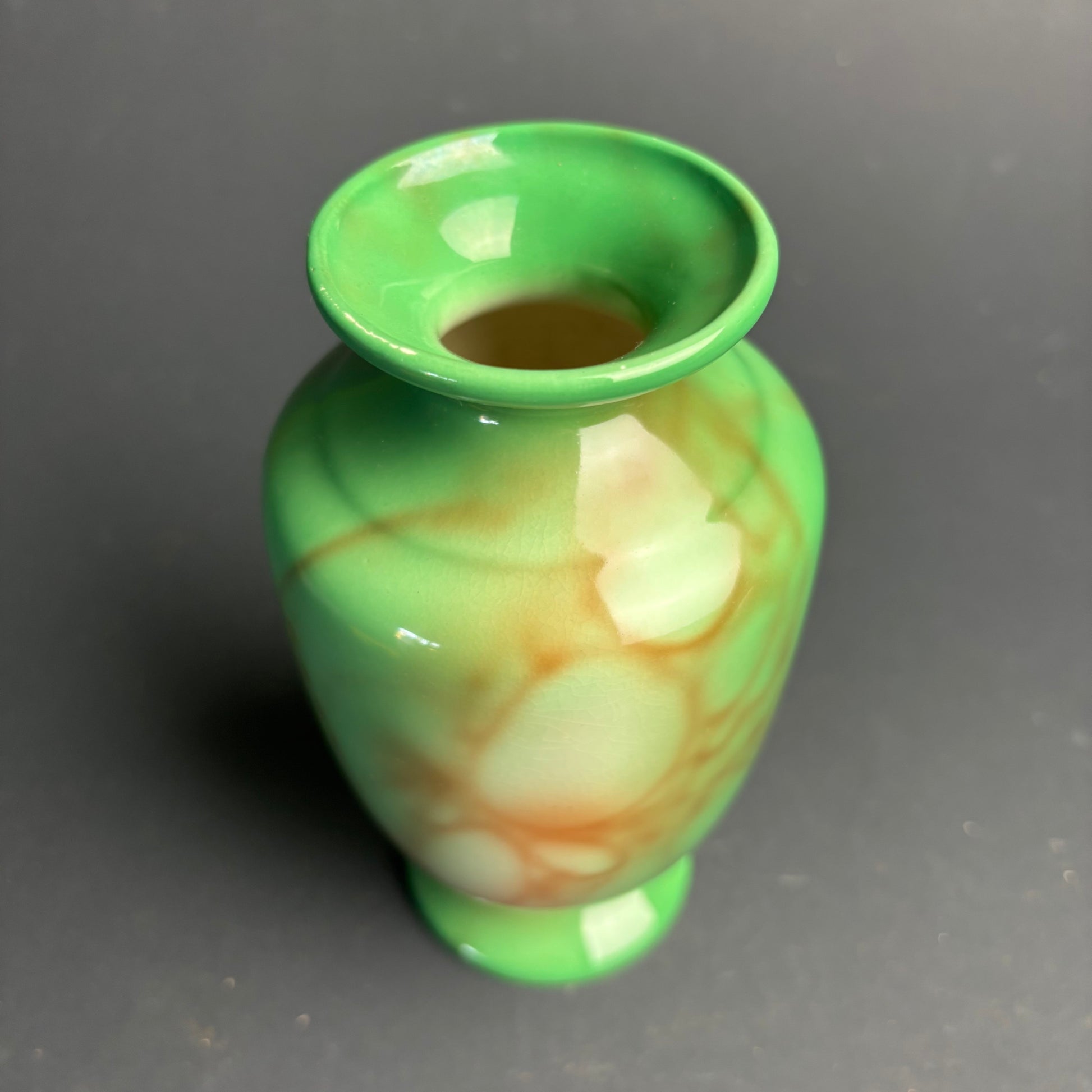 A striking vintage Falcon Ware vase finished in a vivid high-gloss green glaze with flowing caramel and cream mottling.