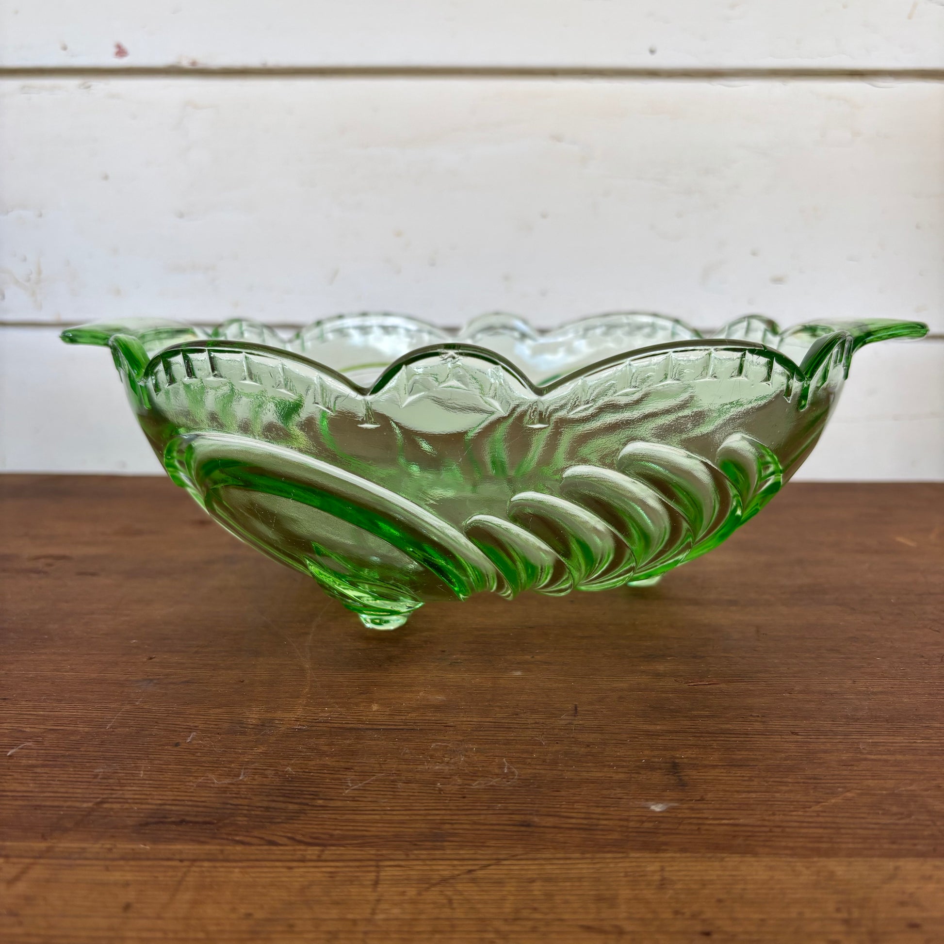 A beautifully pressed green glass serving bowl from the 1930s, featuring dynamic swirling motifs and a pinched dual-handle form. Unlike uranium glass of the same era, this example contains no uranium and does not glow under UV light, making it ideal for collectors who prefer traditional Depression-era glass without luminescence.