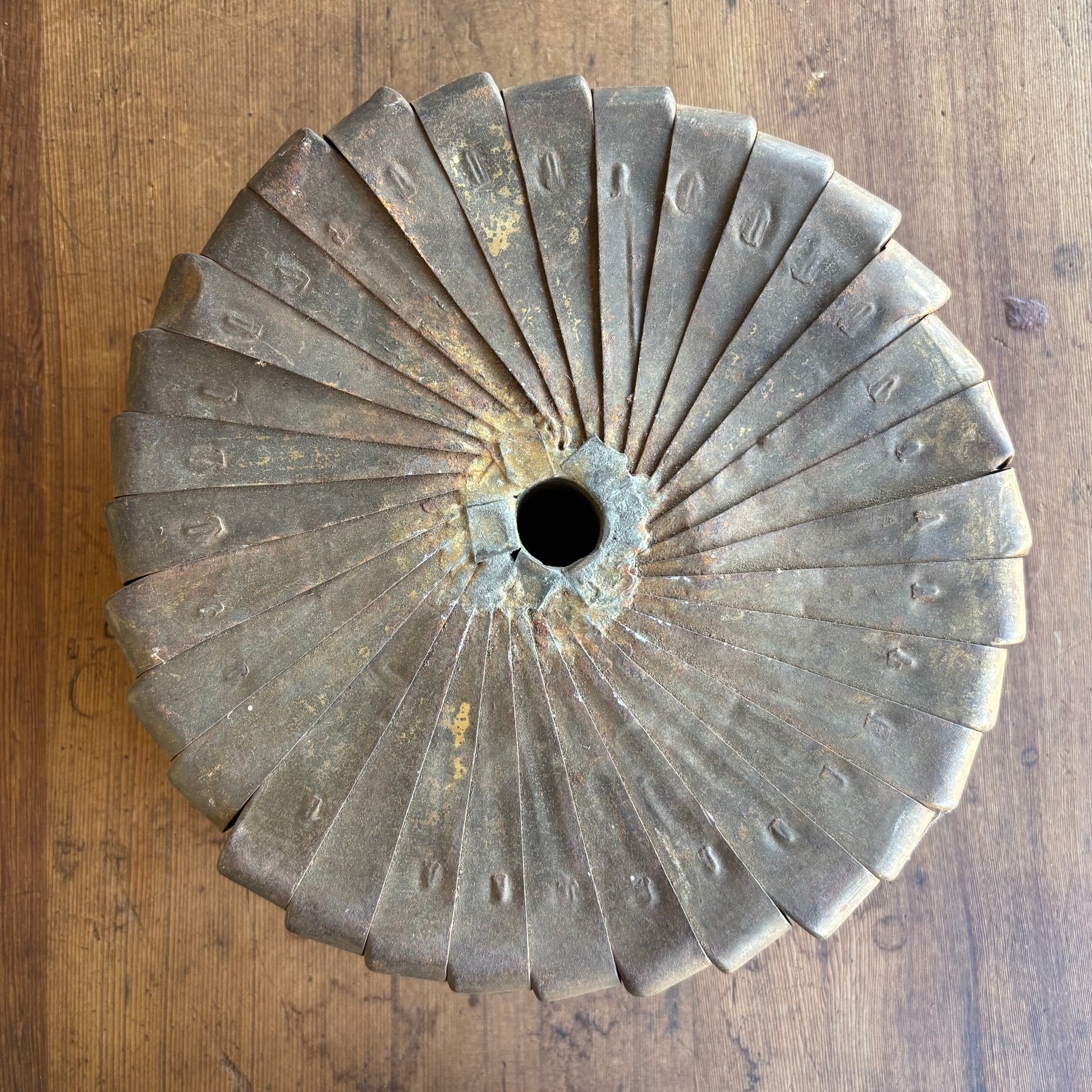 A great example of Australian bush or workshop folk art—functional but clearly made with an eye for pattern and symmetry. The repeating pressed tin segments create a strong industrial, almost sunburst-like form.