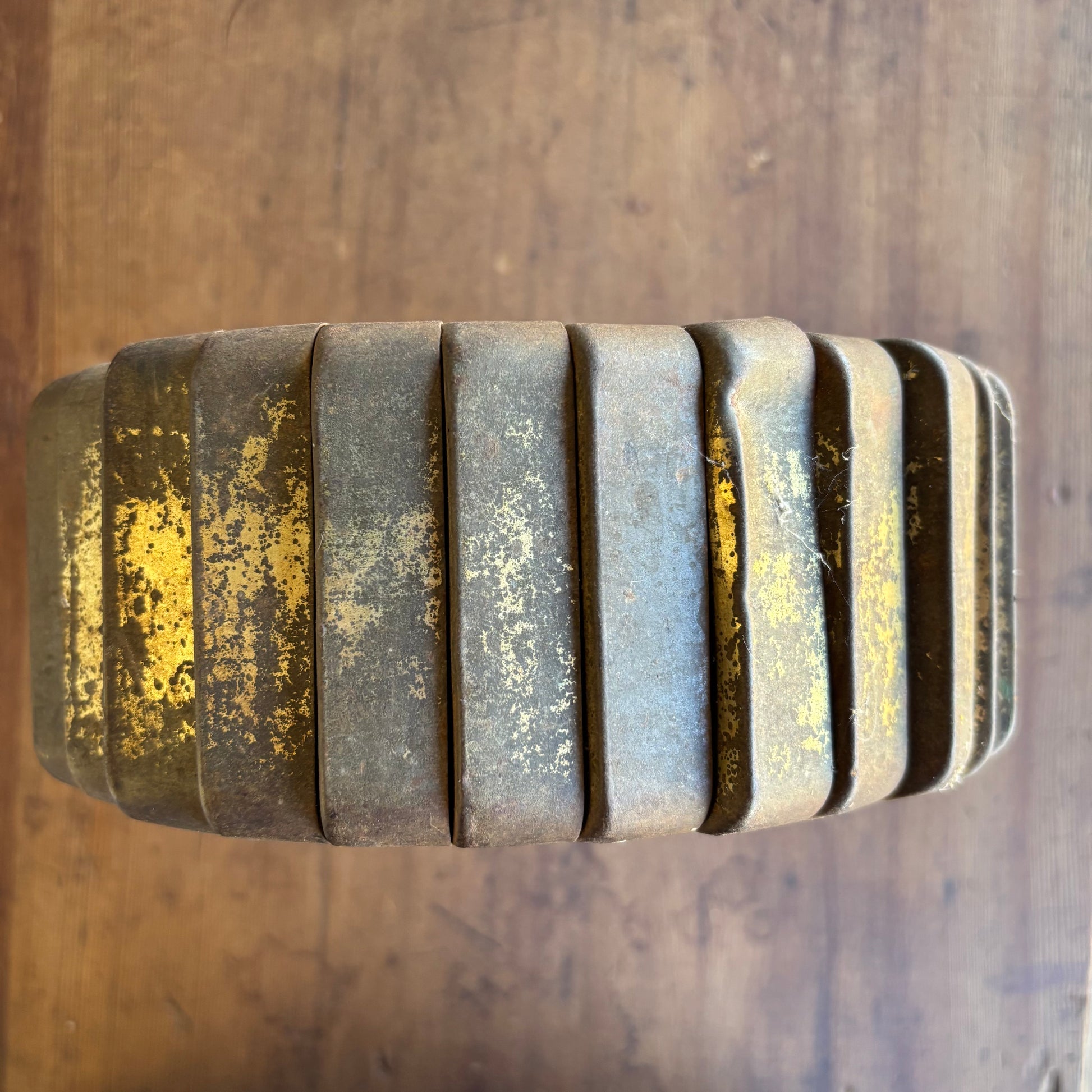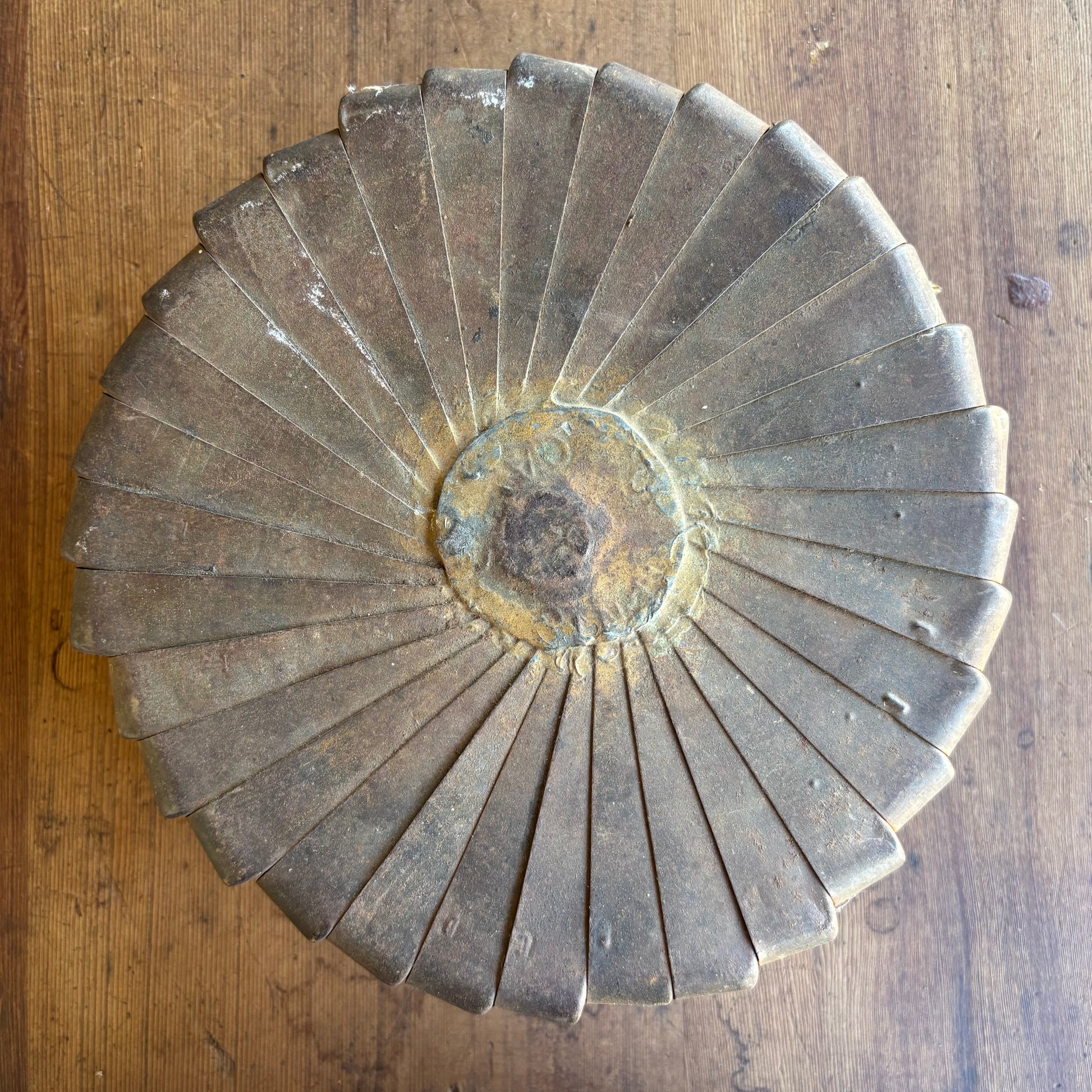 Striking handmade metal bowl constructed from repurposed tobacco tin lids, carefully arranged and fixed into a radial form.