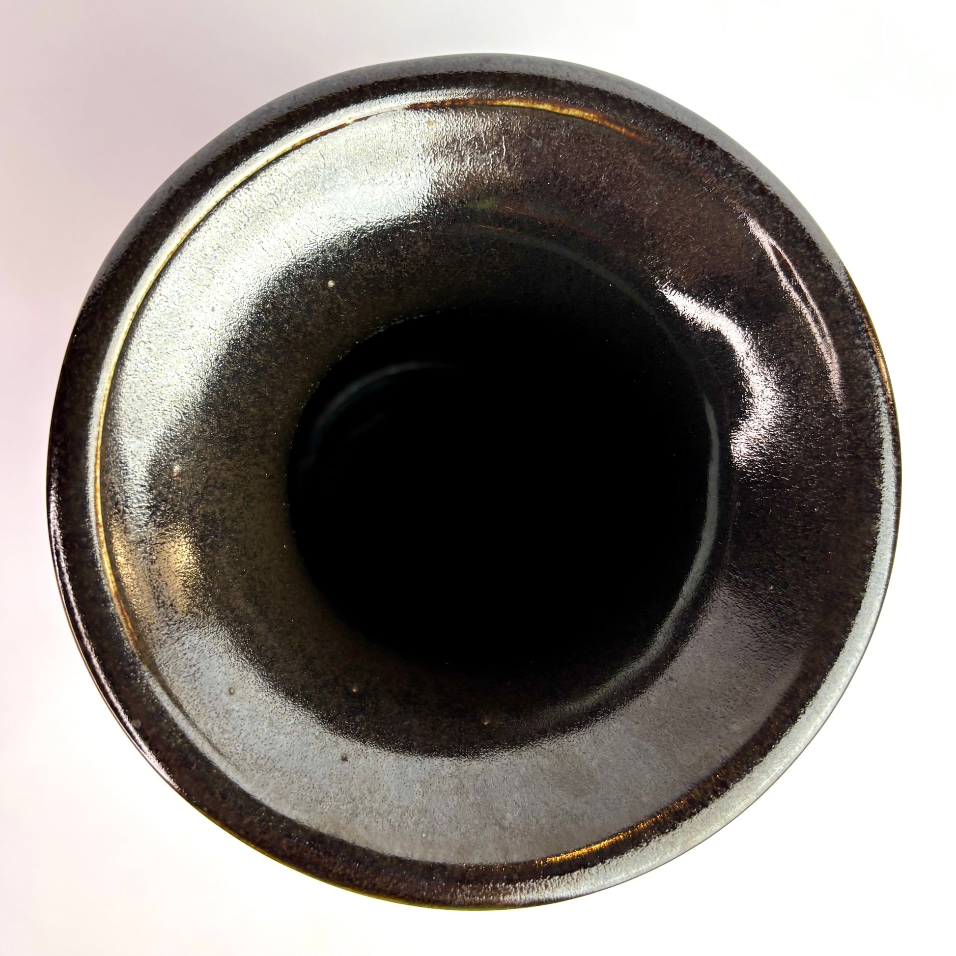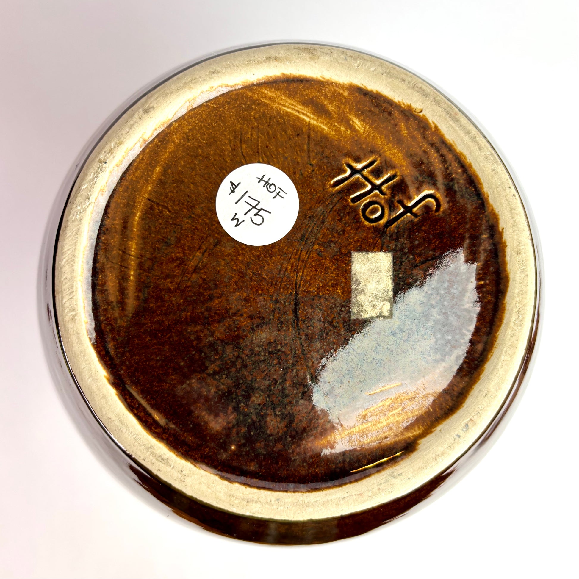 Finished in rich chocolate brown glaze flowing over a textured iron-toned base. High gloss upper body with darker interior and flared rim. Stamped Höf mark to base.