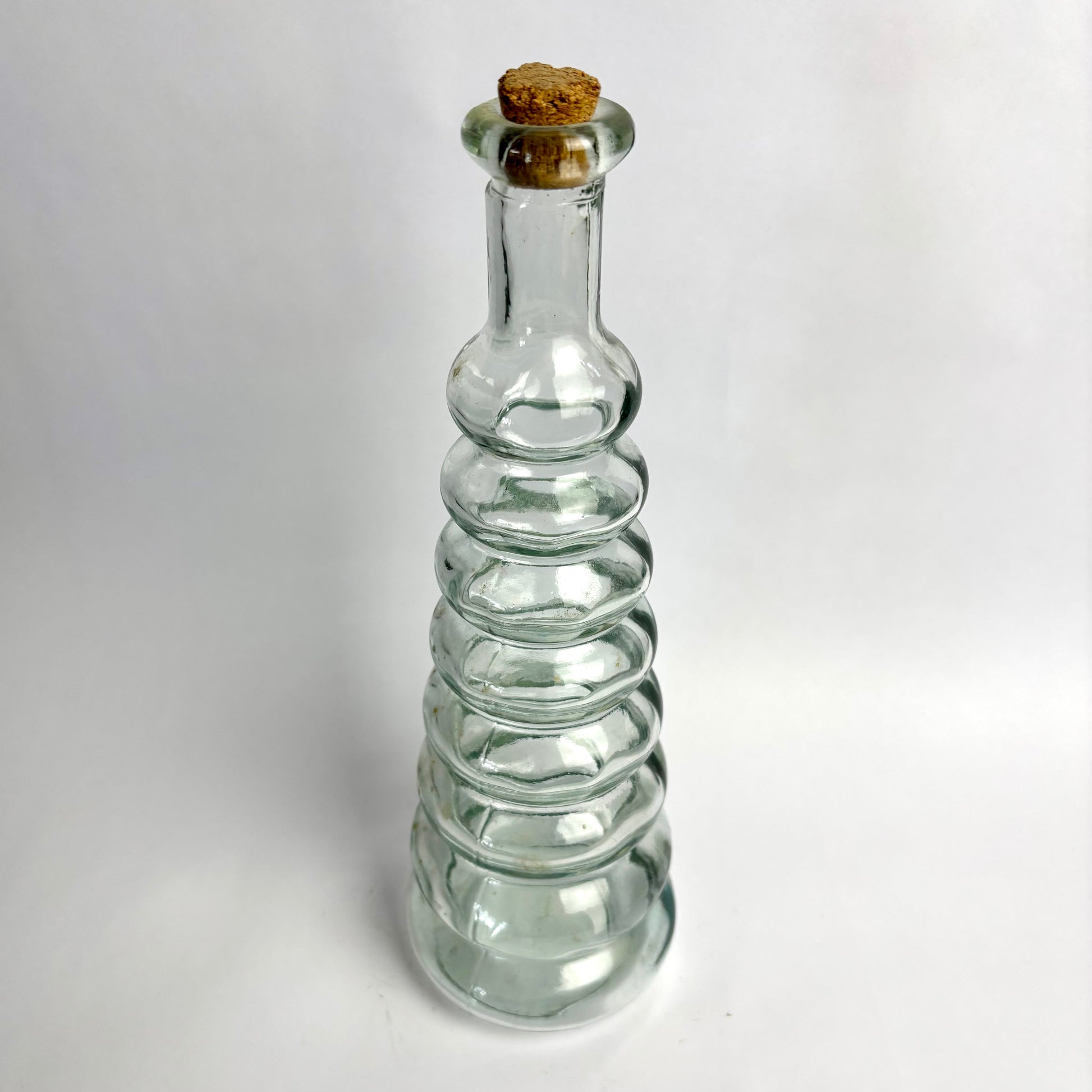 Clear glass with soft green tint and rounded “bubble” bands down the body. Finished with a flared collar and cork stopper.
