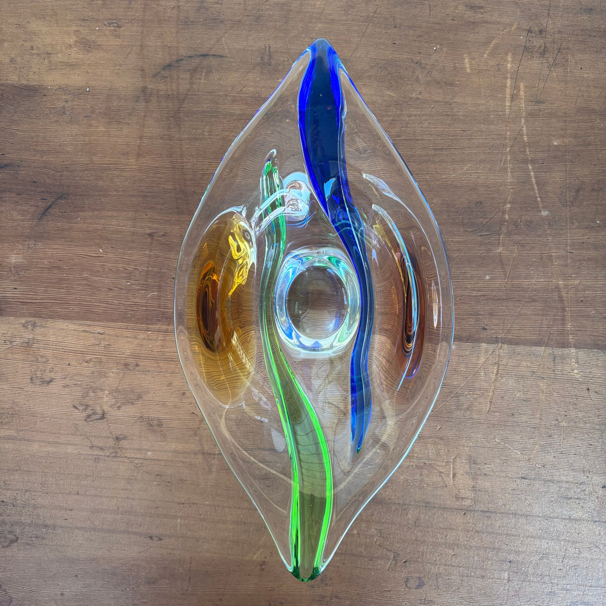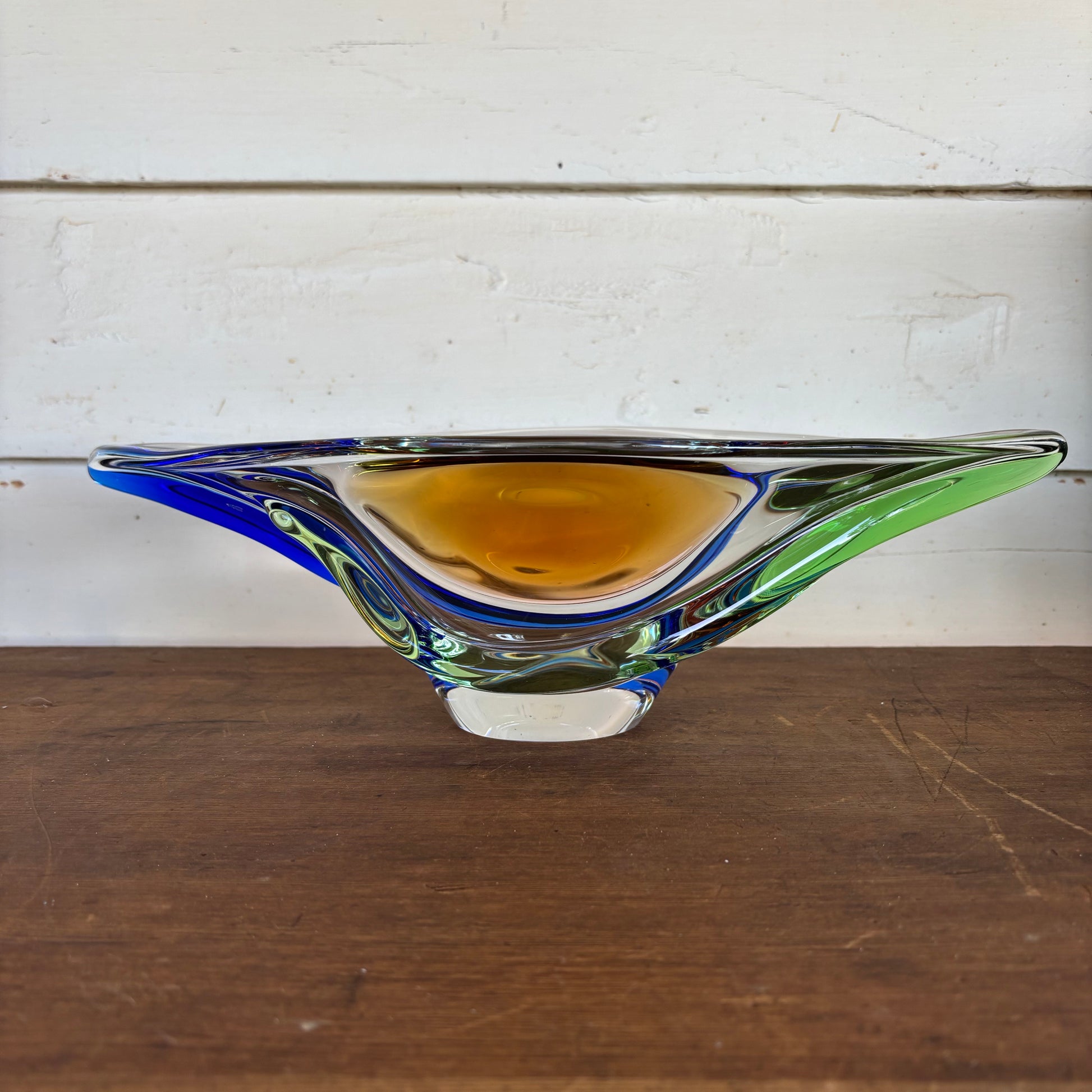 This sculptural bowl exemplifies Zemek’s mastery of flowing organic form and controlled colour composition. The elongated freeform profile is layered with sweeping bands of cobalt blue, emerald green and warm amber, encased in crystal-clear glass. A polished clear foot elevates the form, allowing light to refract through the coloured layers with remarkable depth and movement.