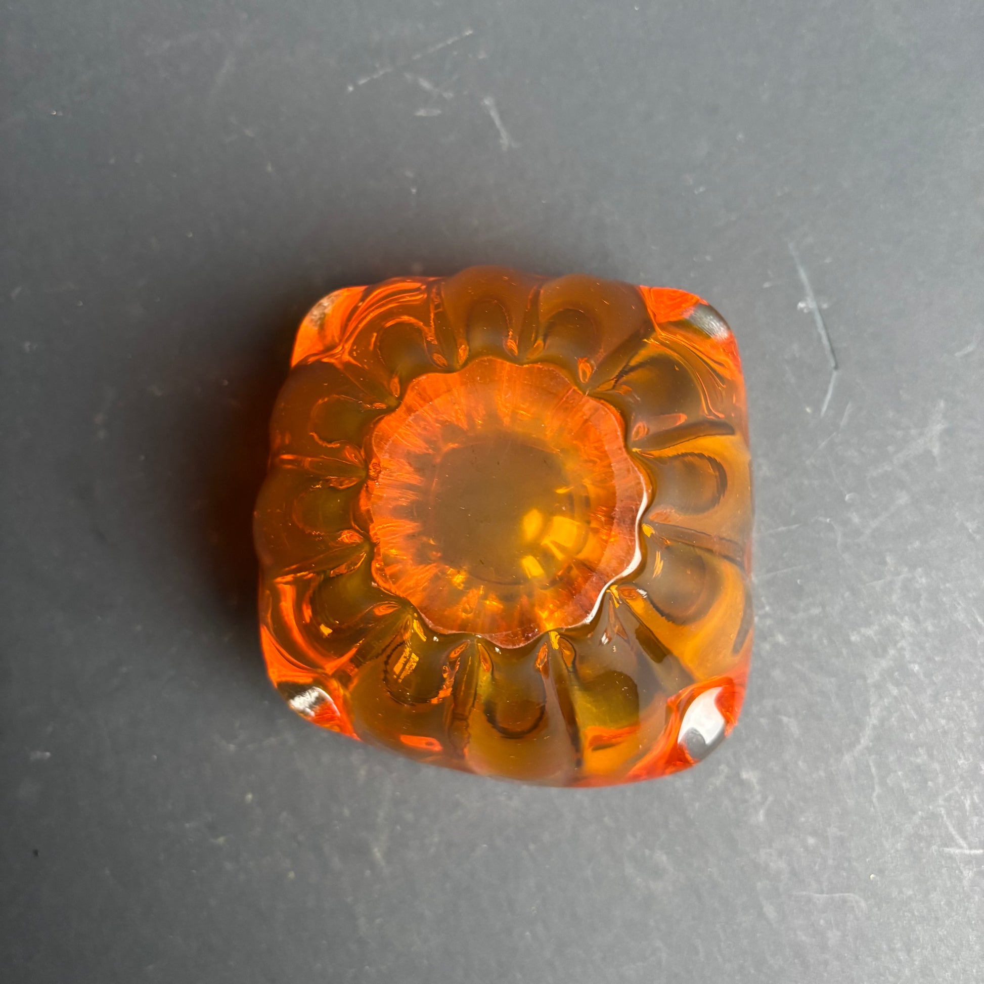 Vibrant mid-century amber glass bowl with a bold sculptural form.