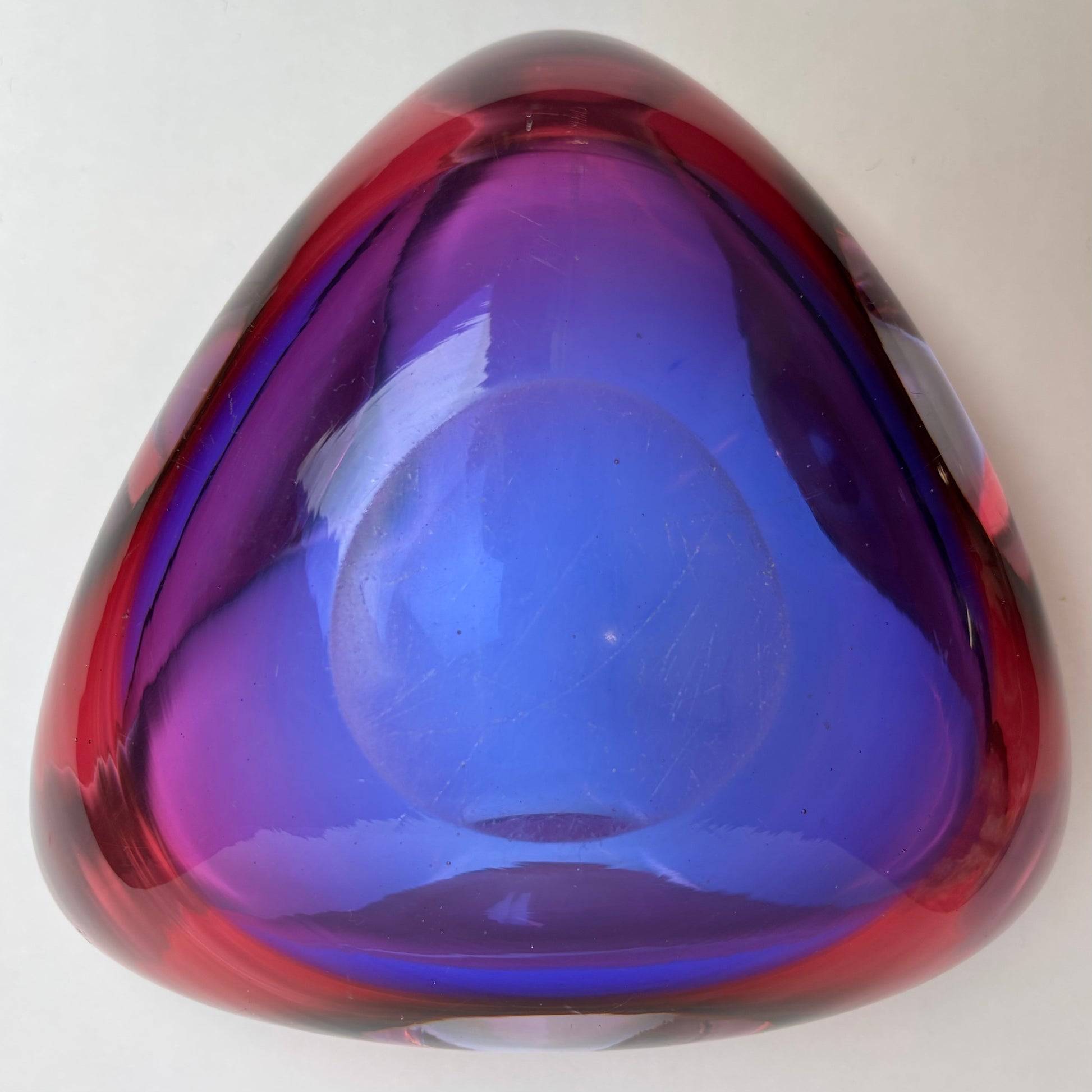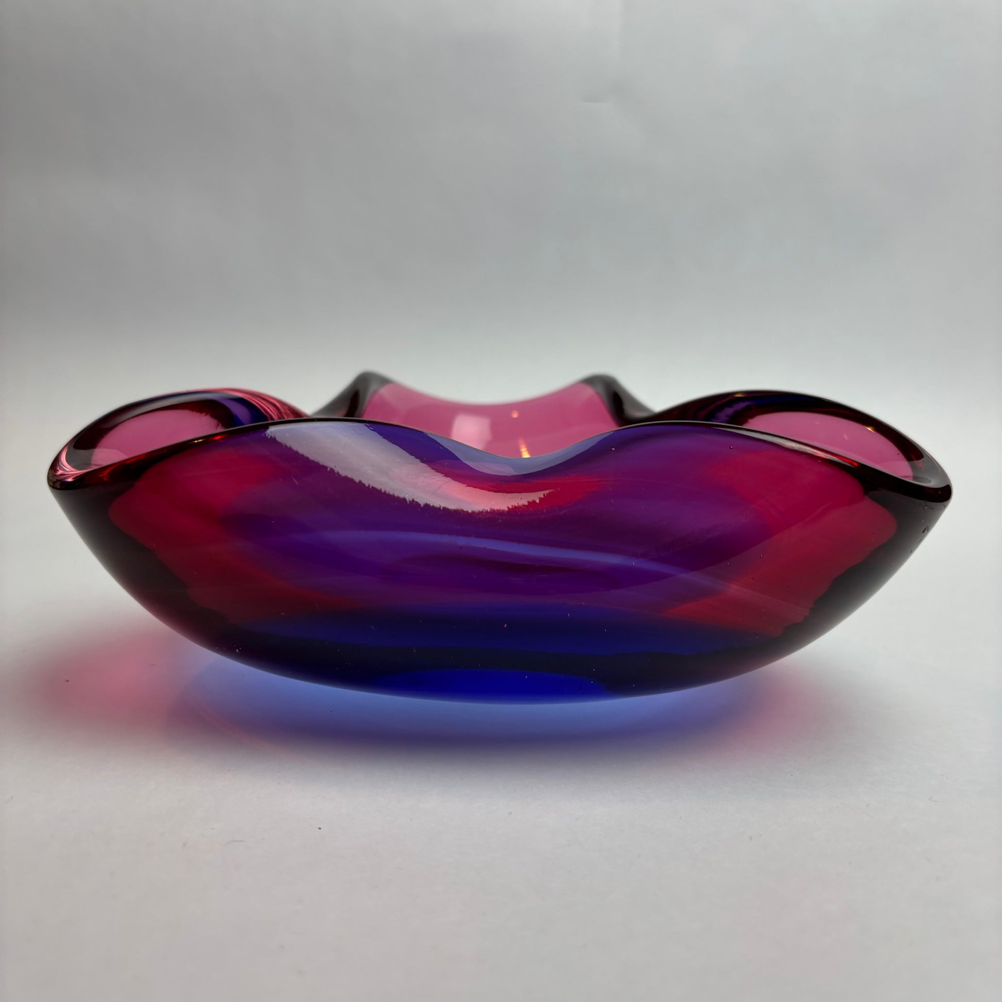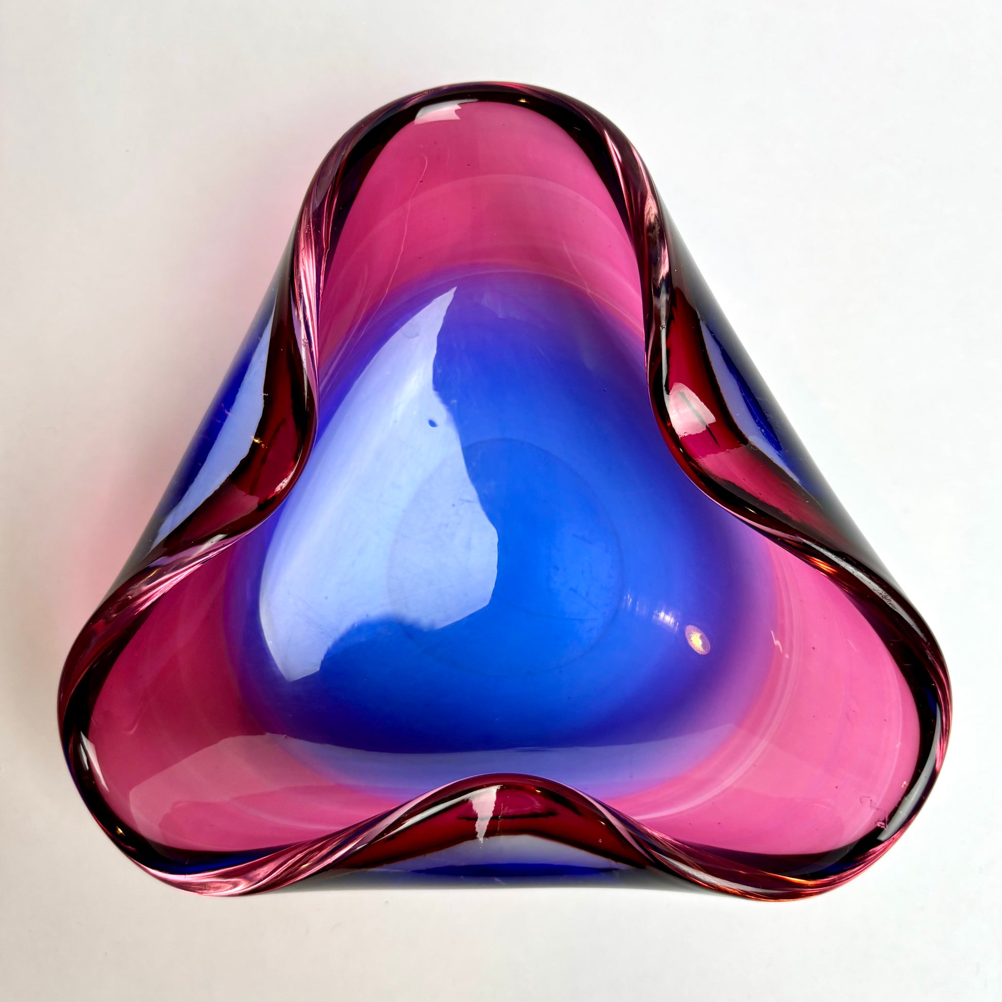 The sculptural triangular form with softly folded rim is characteristic of European studio and Scandinavian-influenced glass of the 1960s–70s, designed as both a functional centrepiece and a decorative object.