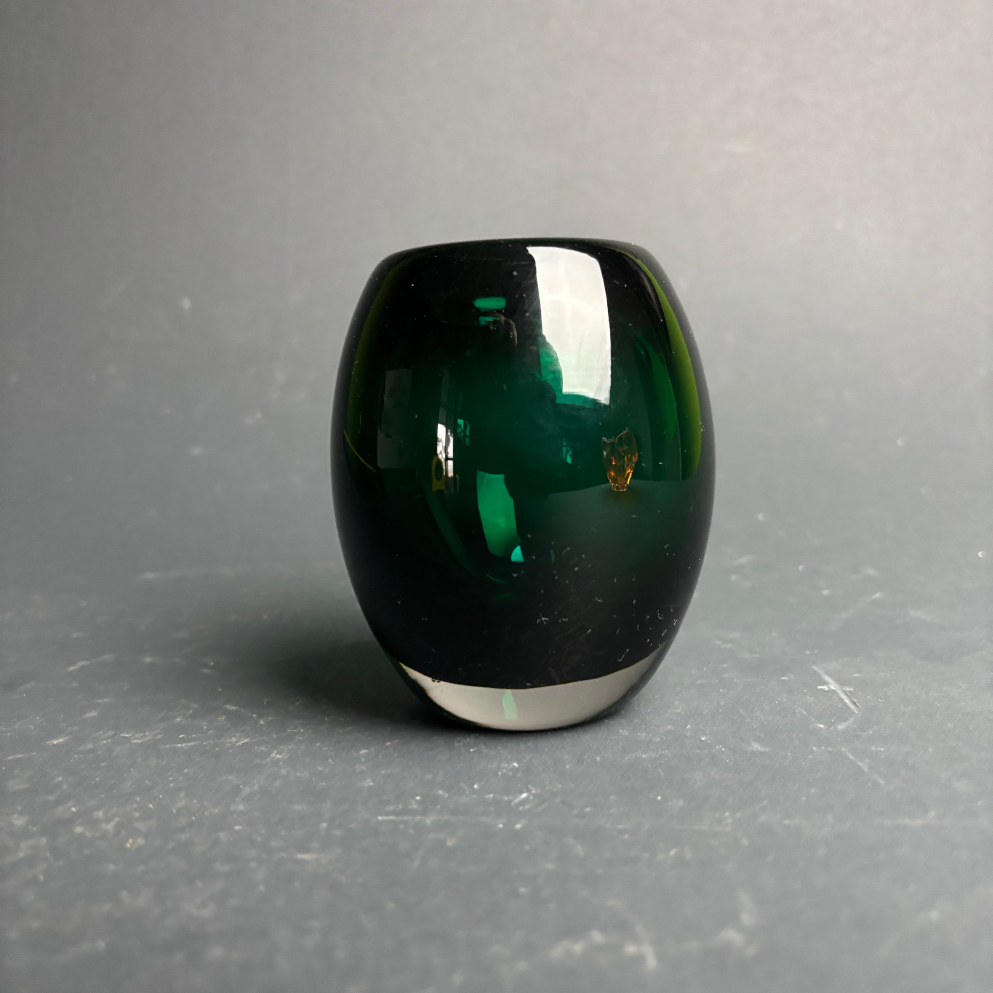 The colour is strong—almost black until it catches the light, then opens up into that rich green. Subtle internal movement and density suggest studio work rather than mass production.