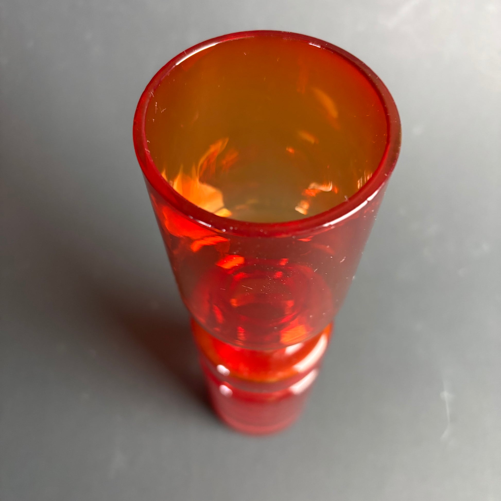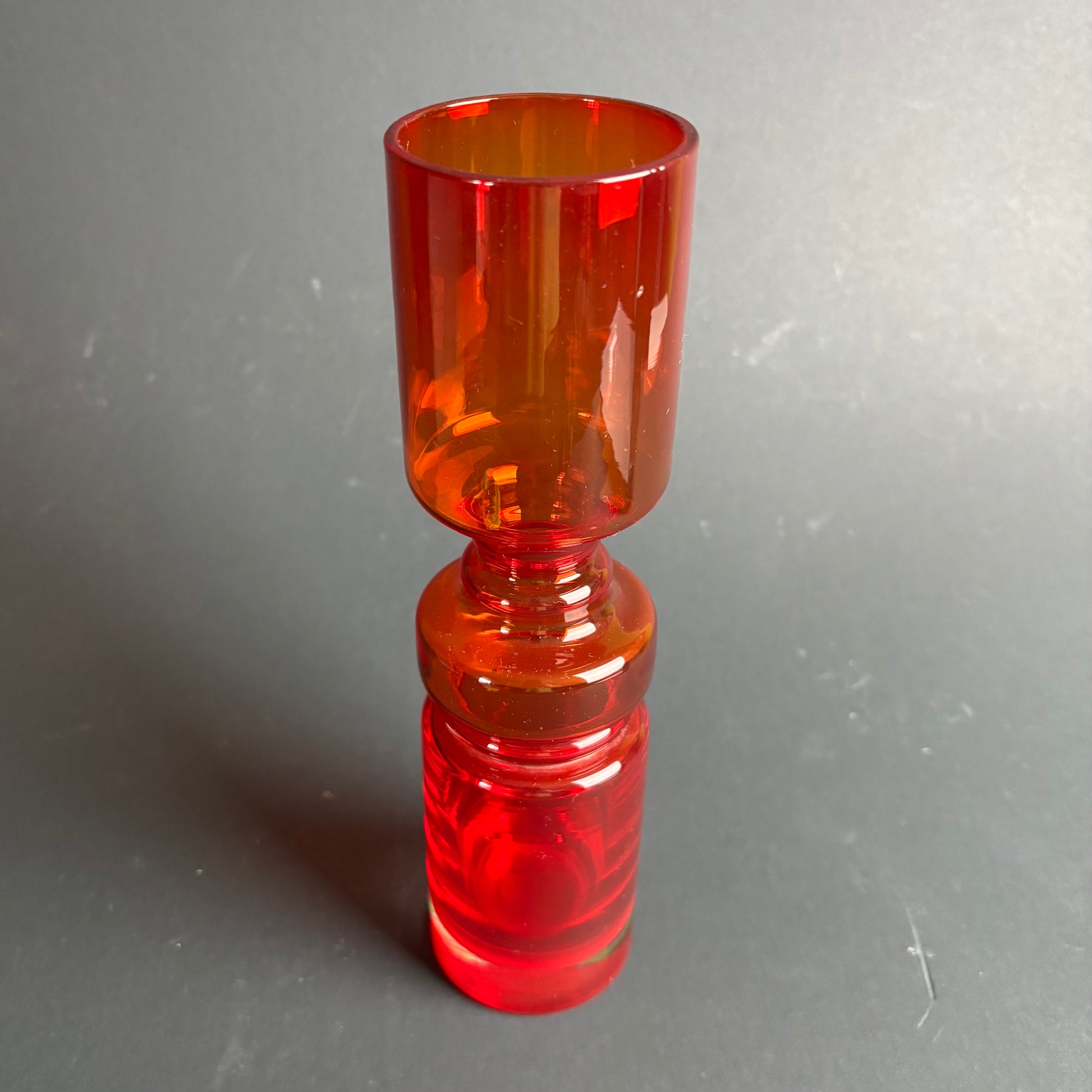 The colour shifts beautifully from deep ruby to glowing amber when light passes through the glass — a classic effect seen in Scandinavian and European art glass from the 1960s–1970s.