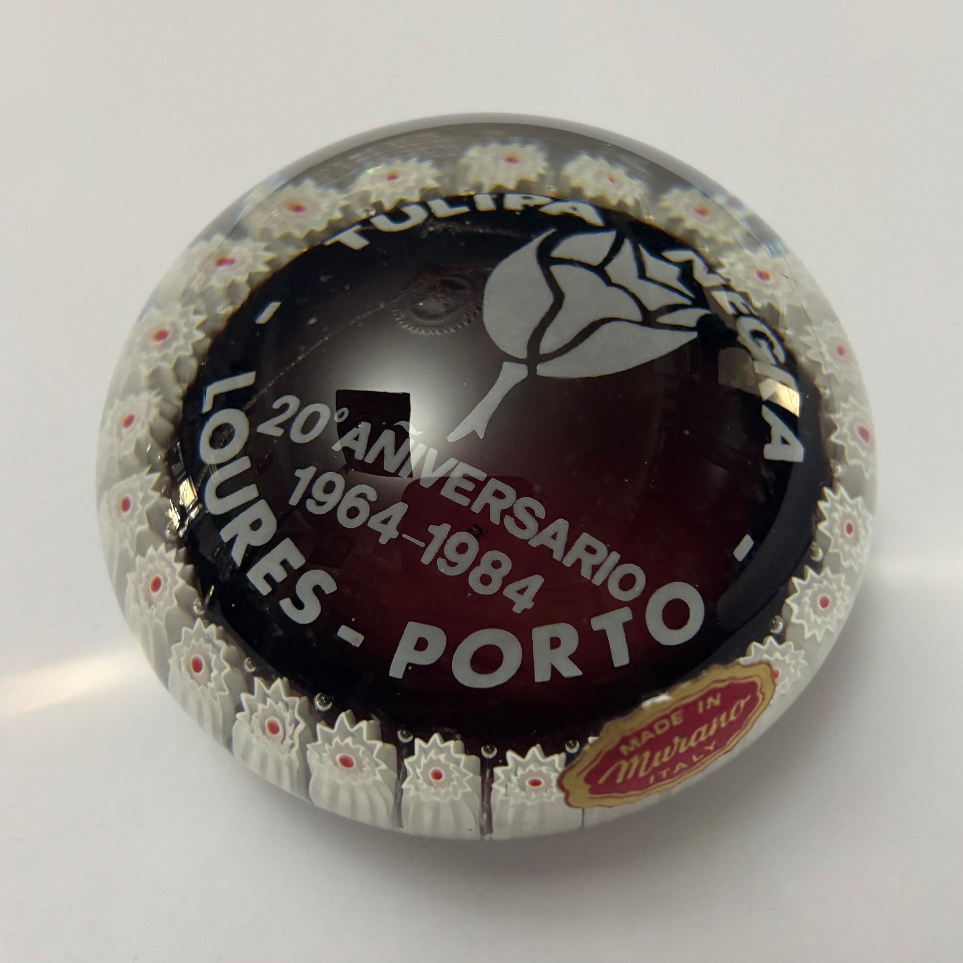 A substantial commemorative paperweight crafted in Murano, Italy circa 1984. Featuring a deep amethyst (almost black) glass core surrounded by white millefiori canes with red accents, and inscribed in white with “Tulipa Negra – 20º Aniversario 1964–1984 – Loures–Porto”. Complete with the original red and gold foil “Made in Murano Italy” sticker.