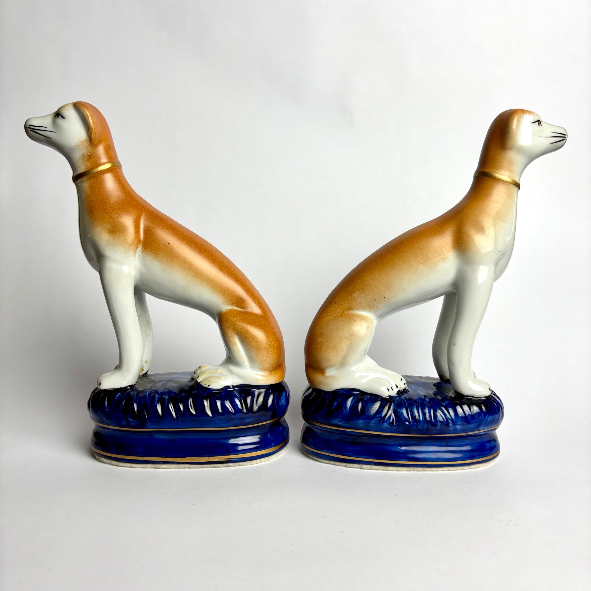 A decorative pair of greyhound figurines produced in the Victorian Revival tradition, inspired by the classic Staffordshire mantel dogs that adorned 19th-century fireplaces and sideboards.
