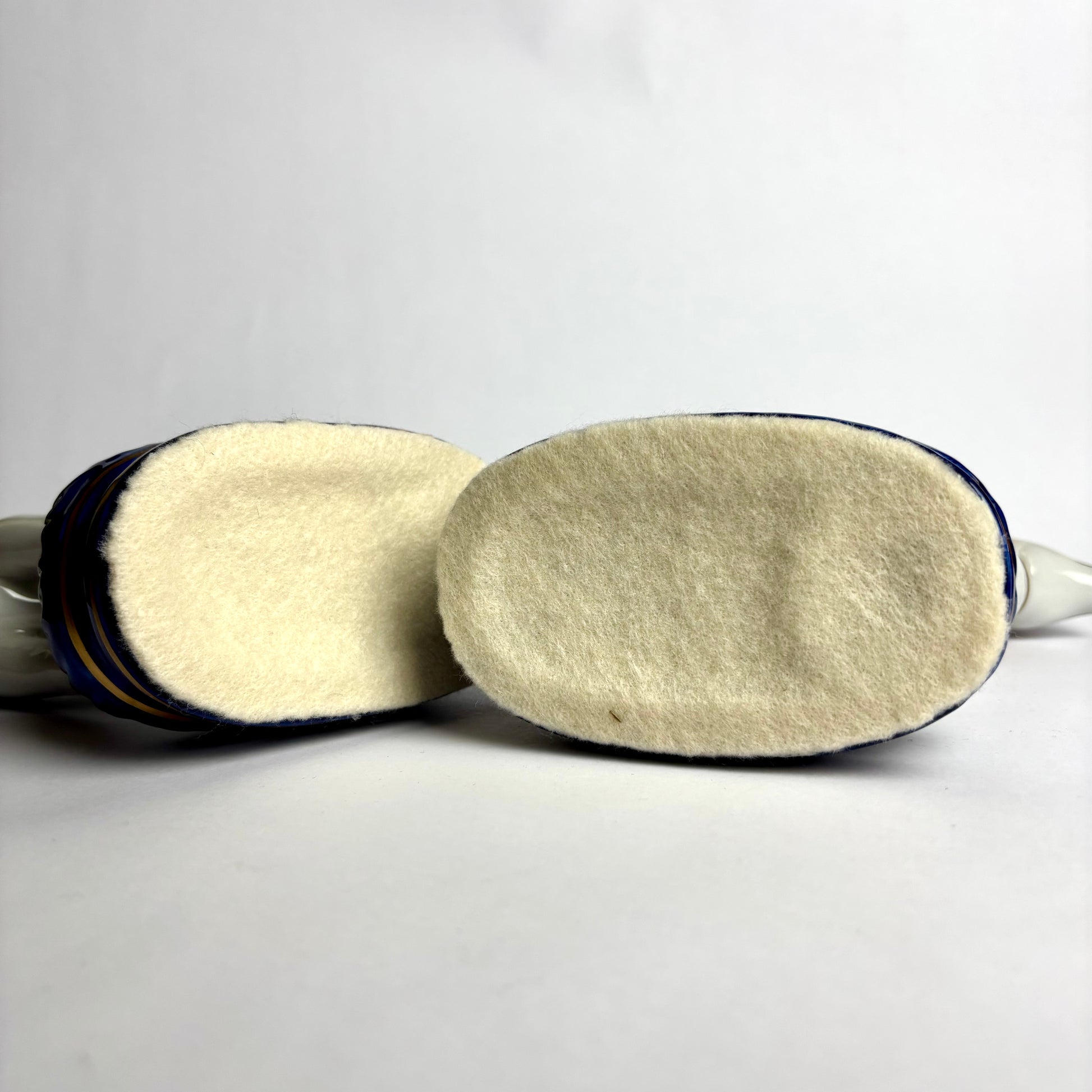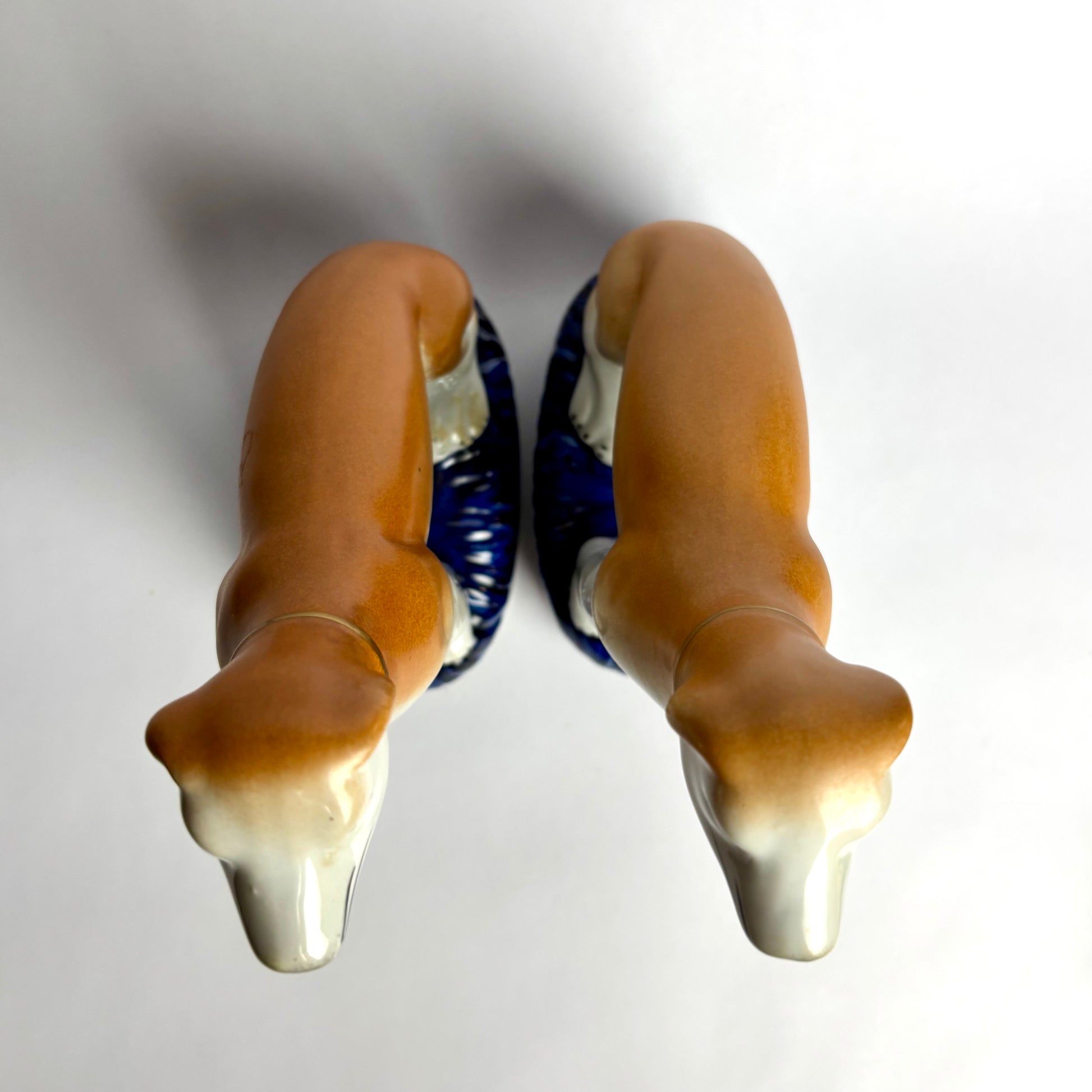 Rather than true bookends, these are sculptural ornaments — modelled in an elegant seated pose and mounted on shaped cobalt-blue bases with gilt banding. The warm fawn shading over an ivory ground gives them a refined, traditional appearance while the clean modelling reflects their mid-20th-century manufacture.