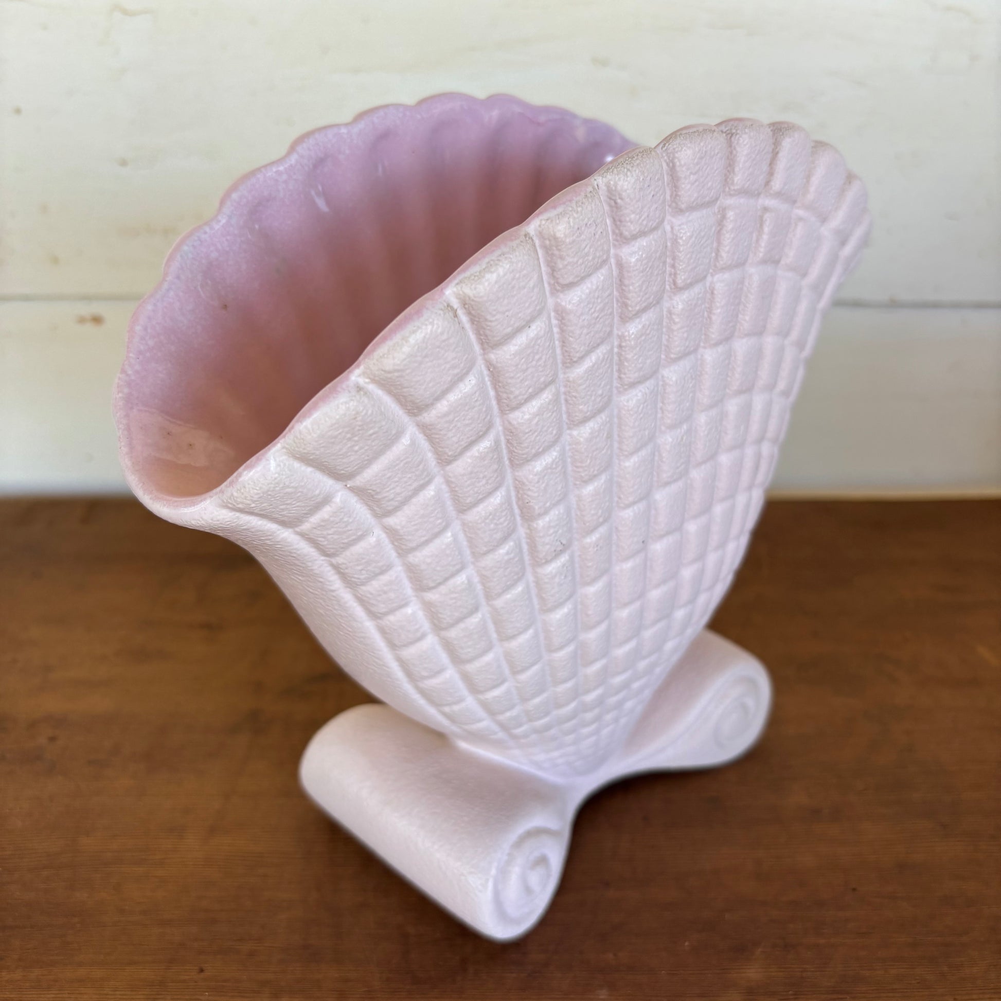 This elegant piece features Raynham’s distinctive fan or shell form with a textured basket-weave exterior and scroll base. Finished in a soft blush pink glaze, it’s a classic example of the decorative pottery the Norfolk maker became known for during the 1940s–1960s.