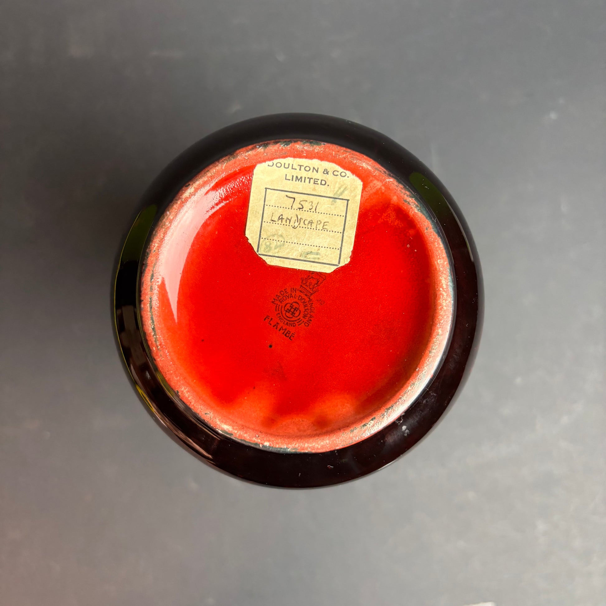 A striking example of Royal Doulton’s celebrated flambé ware, featuring the classic “Landscape” pattern in black silhouette against a rich oxblood red ground.