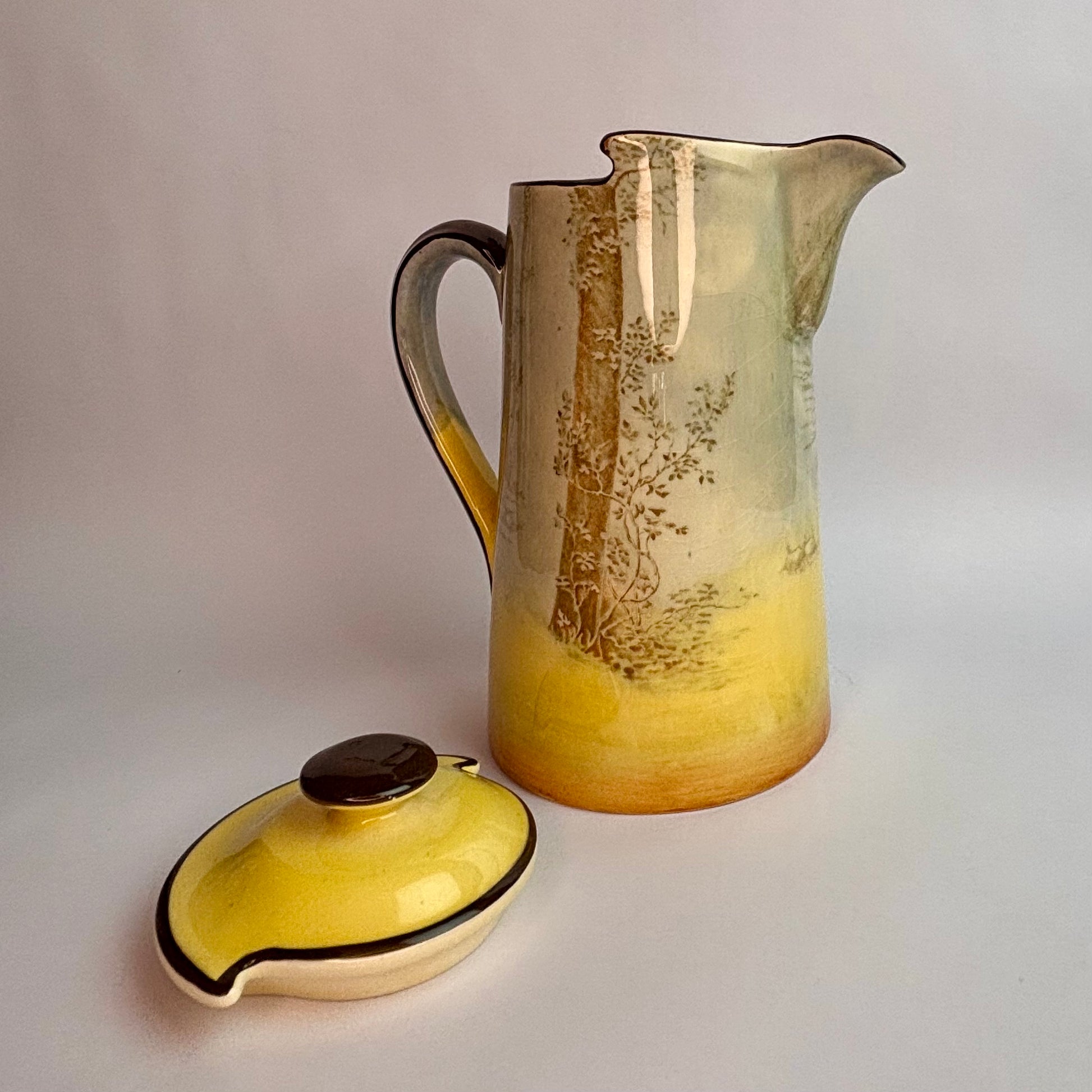 This tall jug form, complete with its original fitted lid, has strong visual presence and displays beautifully from all angles — a fine example of Royal Doulton’s narrative ceramics.