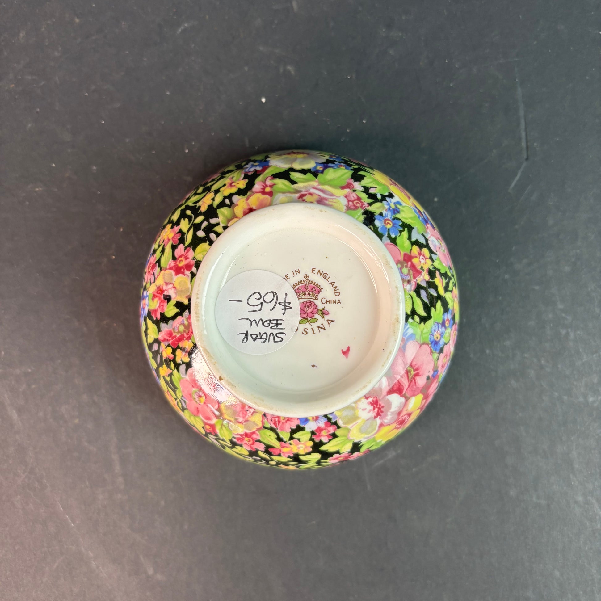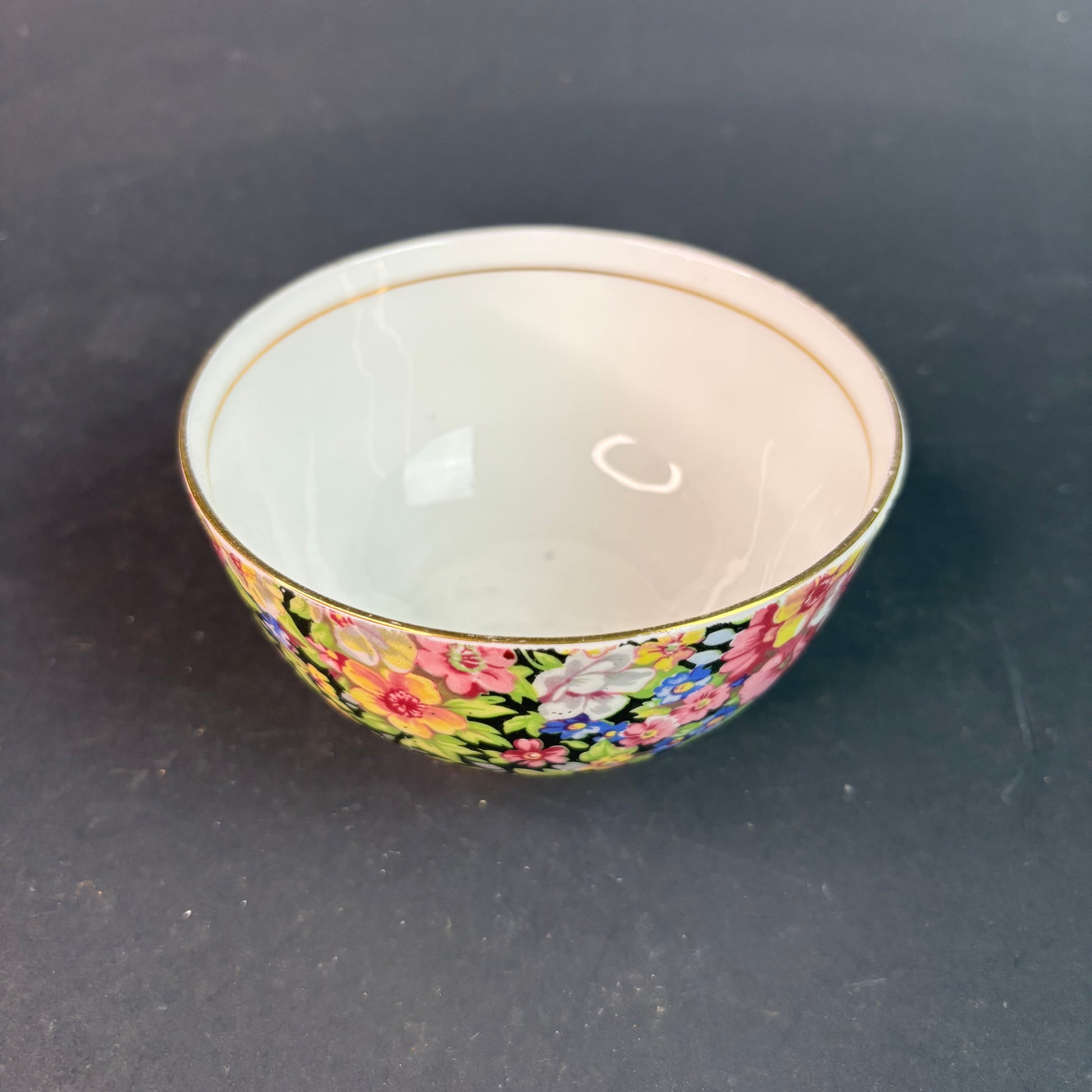 Proper English chintz. Royal Winton / Grimwades “Summertime” pattern with dense floral transfer on a black ground, one of the more striking variants.