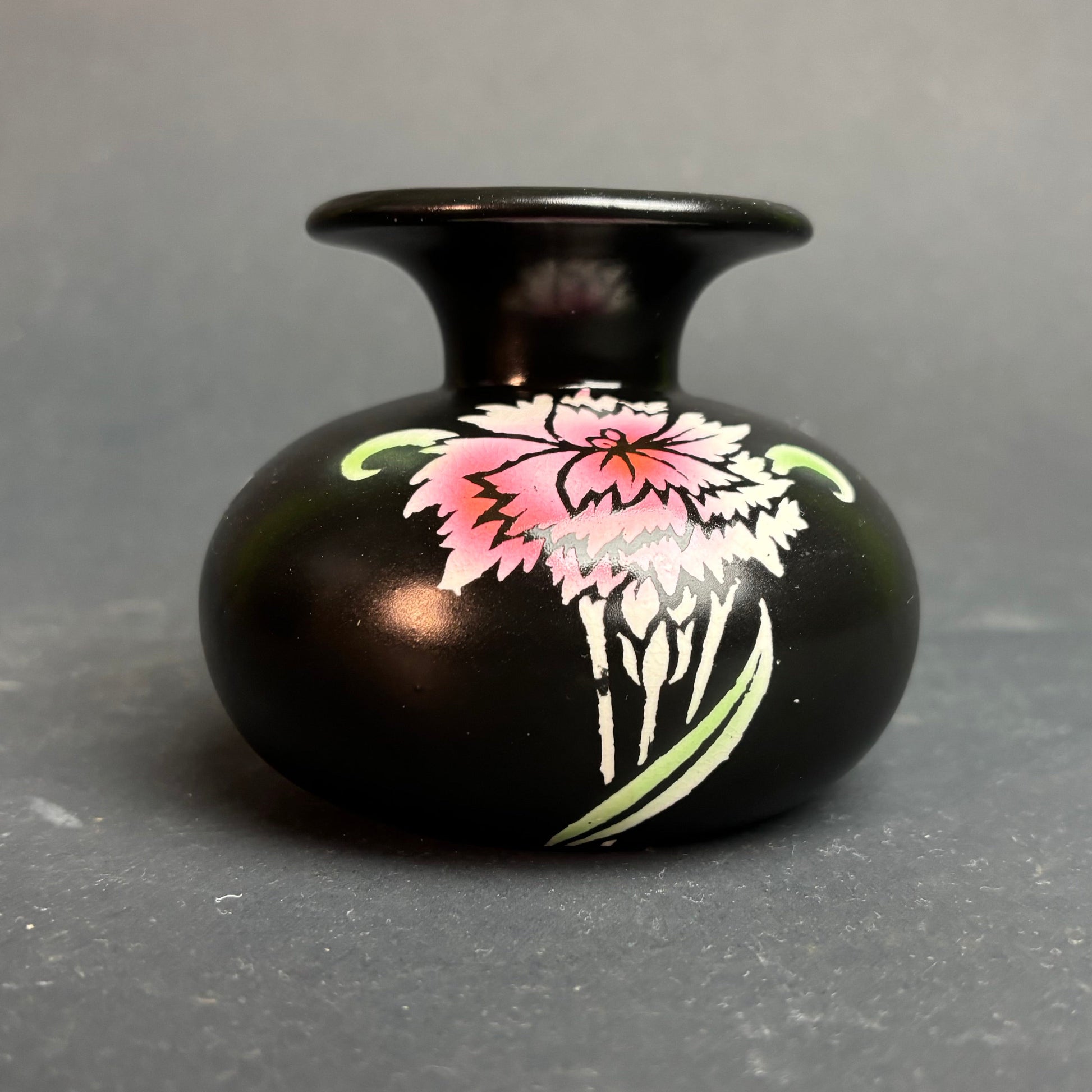 Finished in a deep black ground, the body is decorated with a hand-painted floral motif in soft pink, green and white tones. The low, rounded form with a short flared neck gives the piece a strong Art Deco character, suited to small arrangements or display.