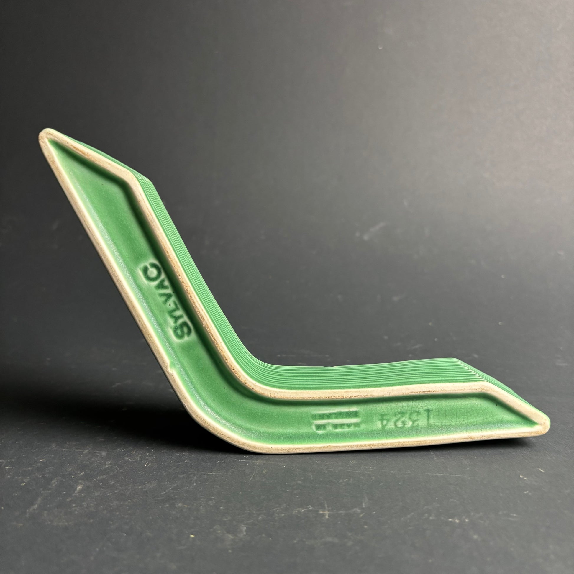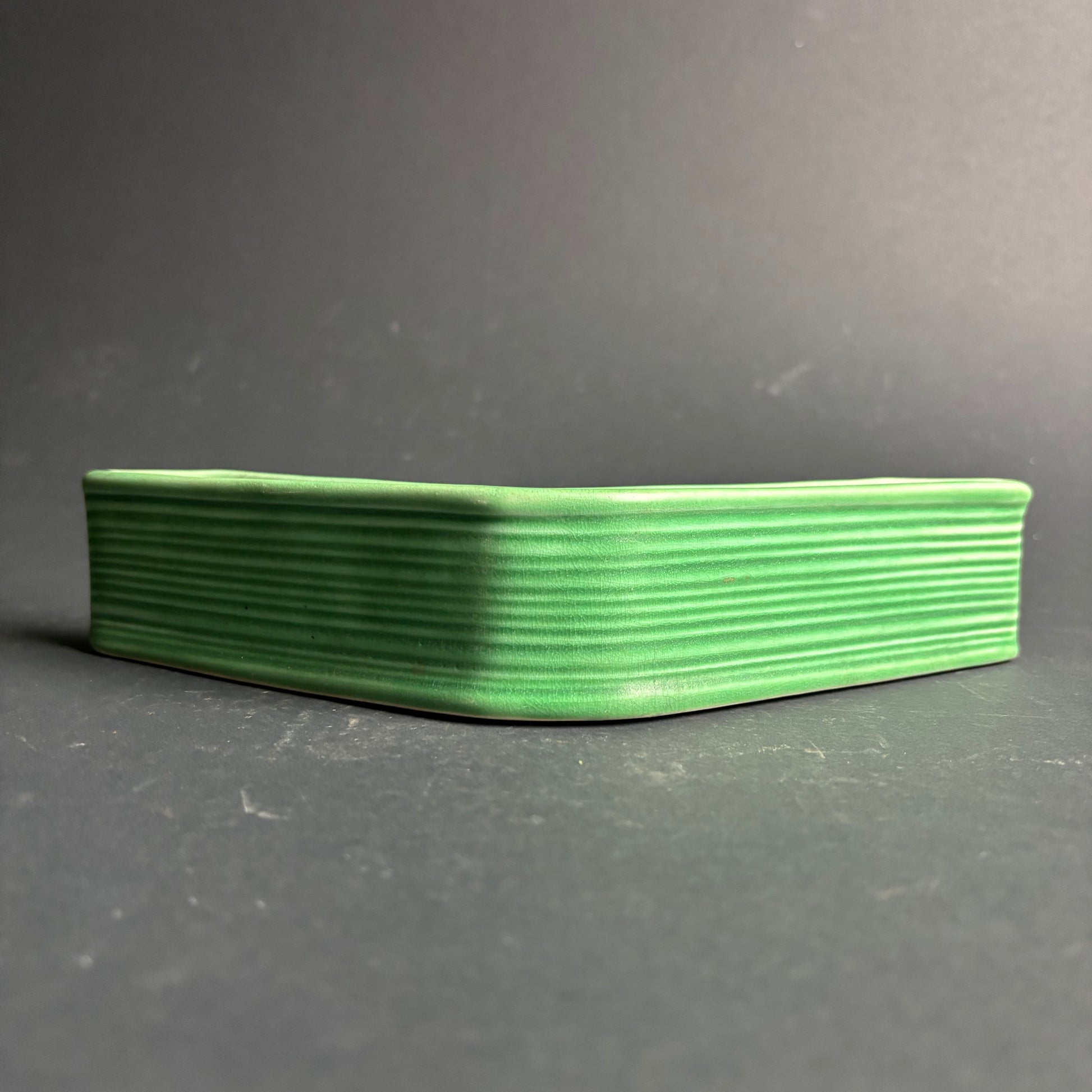 Model 1324, designed to sit neatly into a corner or along a shelf edge. Features a sculptural angular form with horizontal ribbing and a rich green matte glaze.