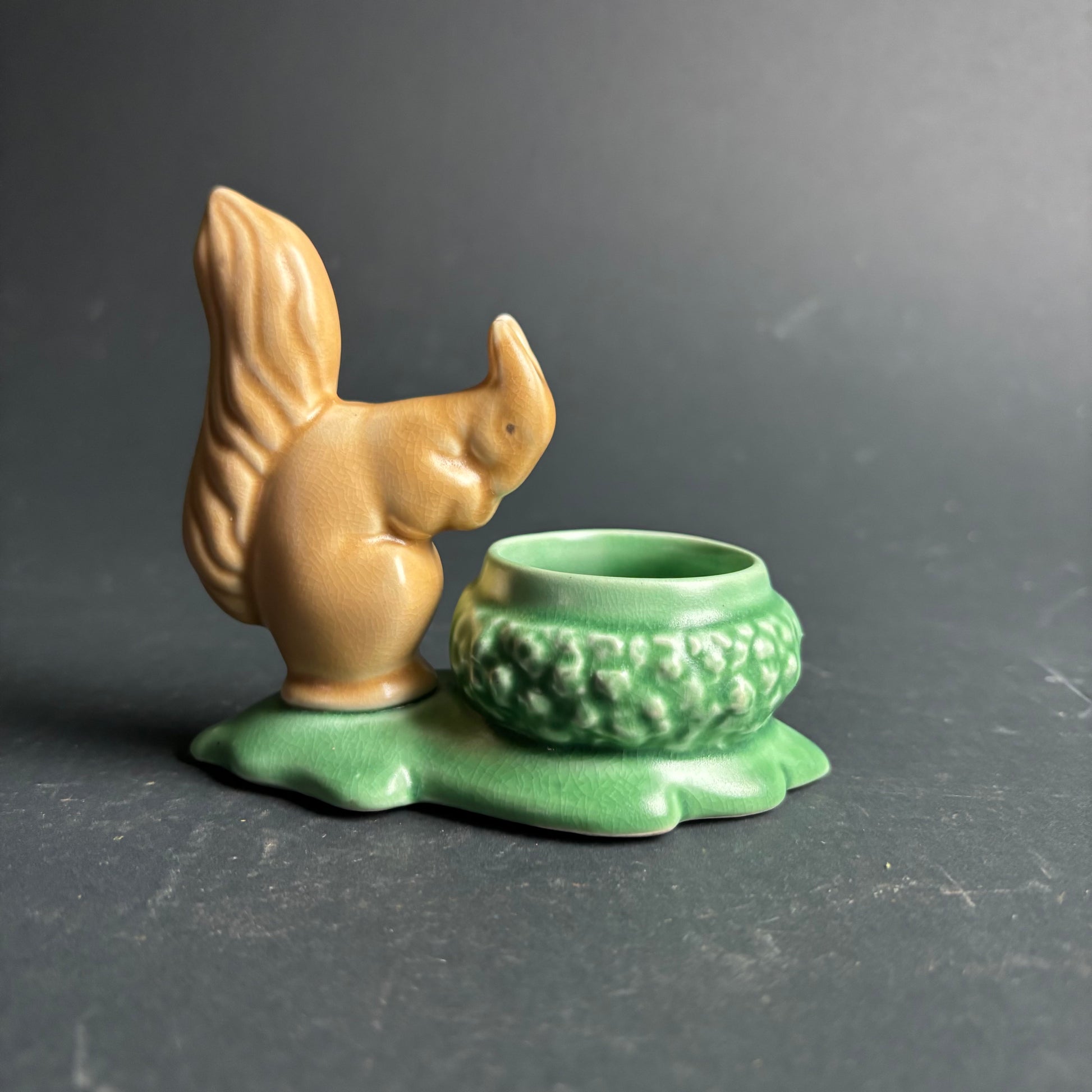 Model 1494, featuring a seated squirrel beside an acorn-shaped bowl on a stylised green base. Finished in contrasting buff and green glazes with fine moulded detail.