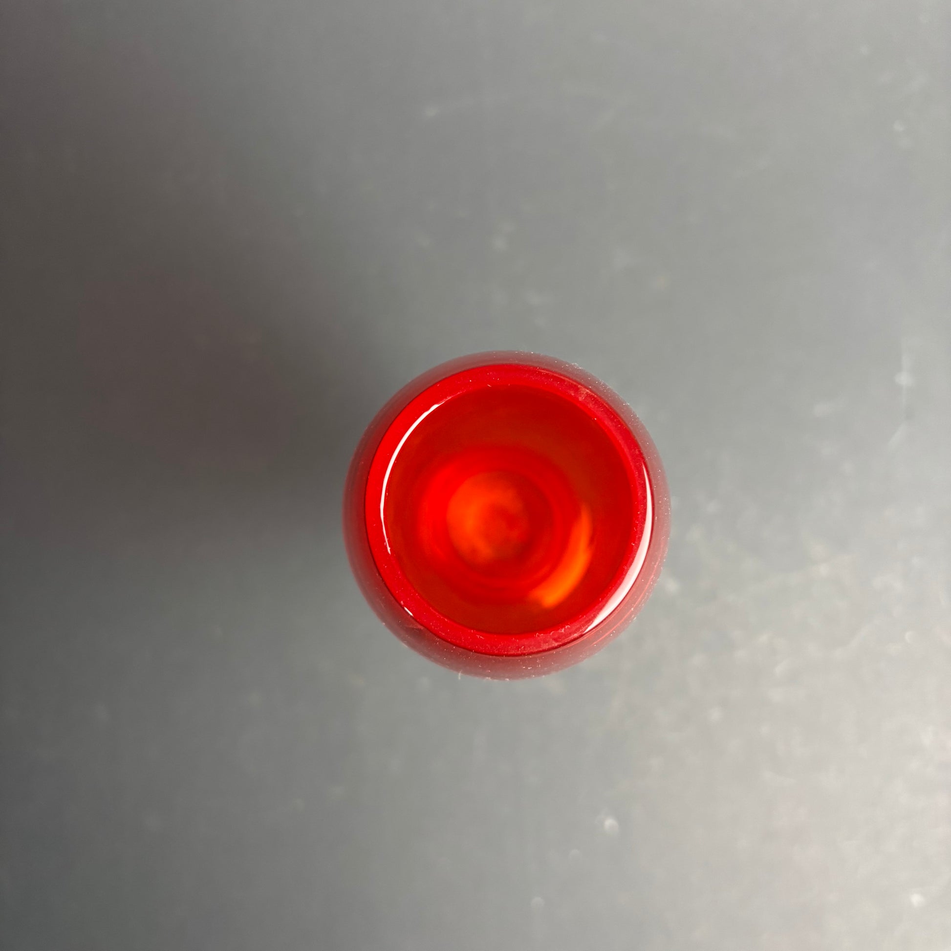 A tall ruby red glass piece with a slender tapered bowl and clear stem, combining the form of a champagne flute with the functionality of a minimalist bud vase.