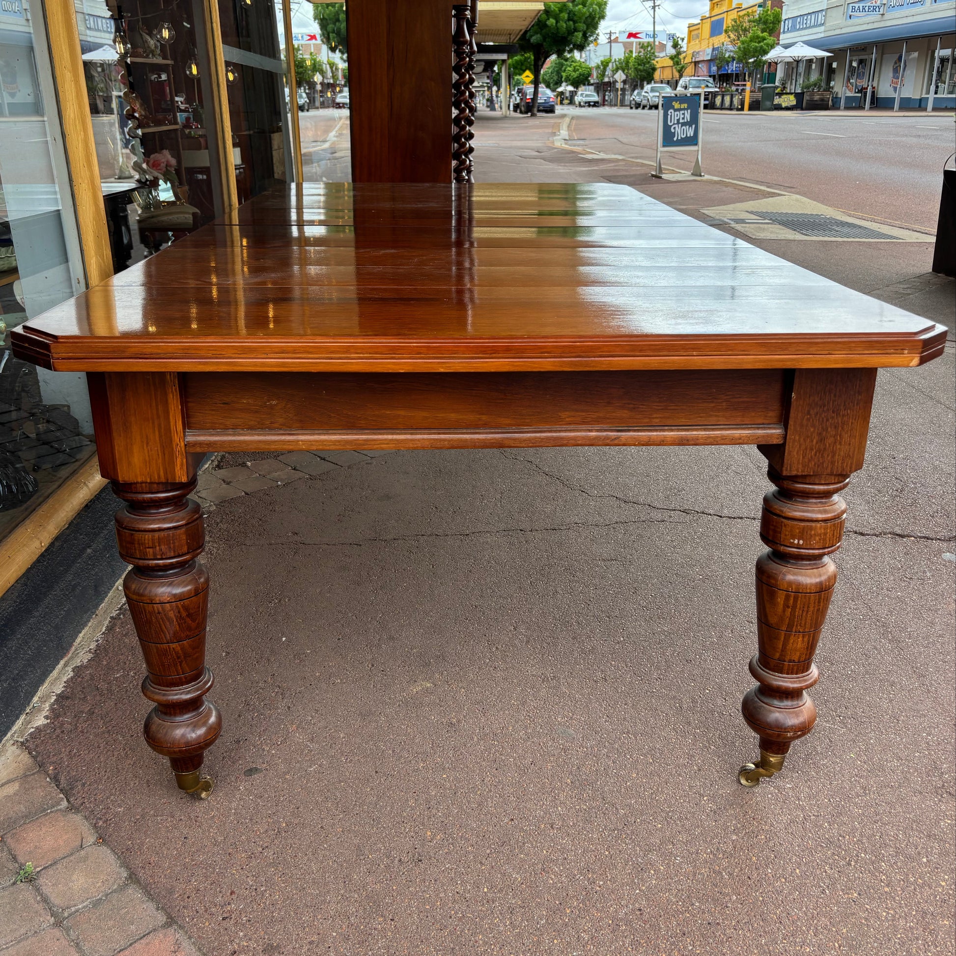 A superb refurbished late Victorian / Federation-era Tasmanian blackwood extension dining table standing on bold turned legs with original brass casters. Beautifully finished with a rich warm glow, this impressive table easily seats 8–10 fully extended — ideal for heritage homes, family gatherings and character interiors.
