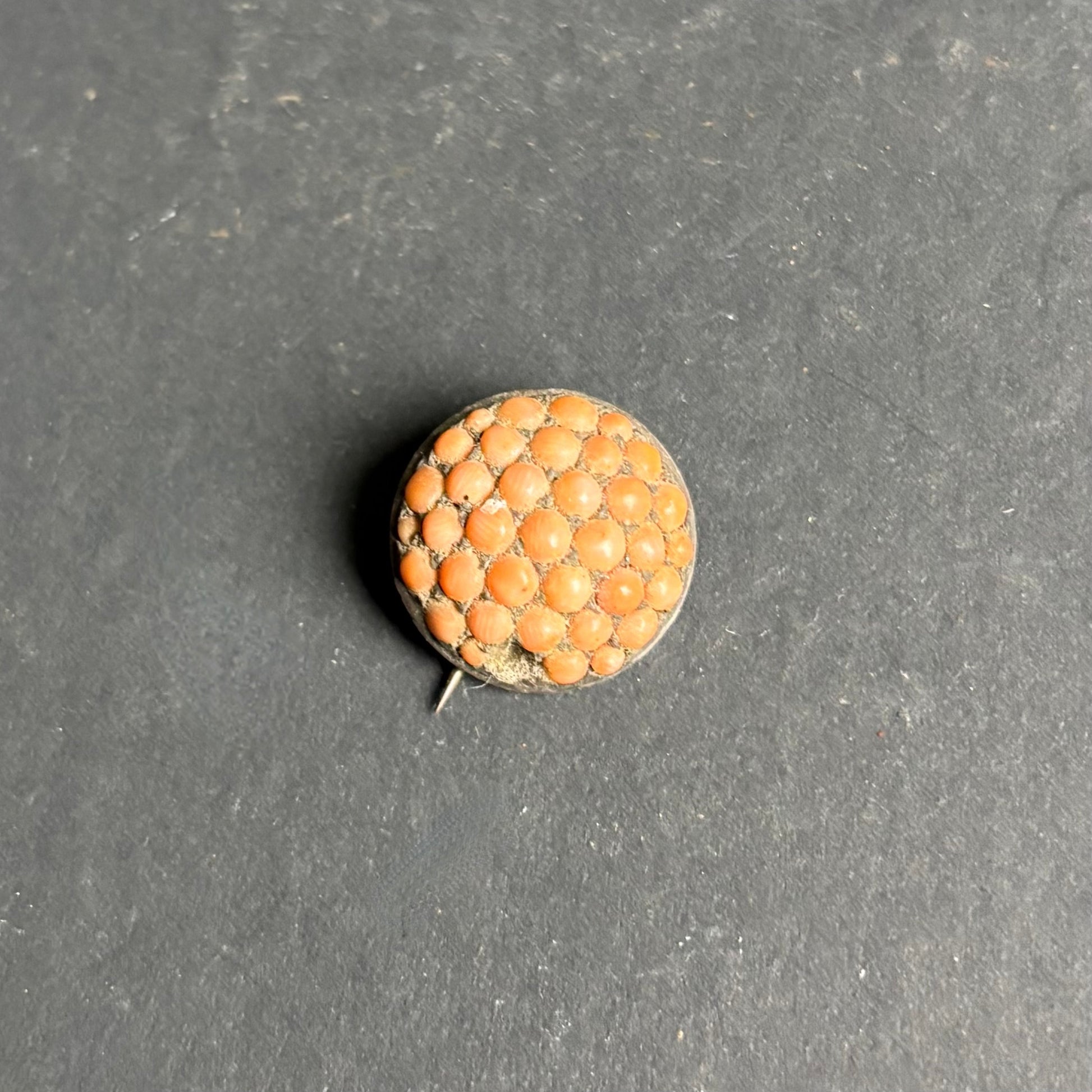 Antique coral cluster brooch featuring a domed arrangement of natural coral cabochons set in silver.