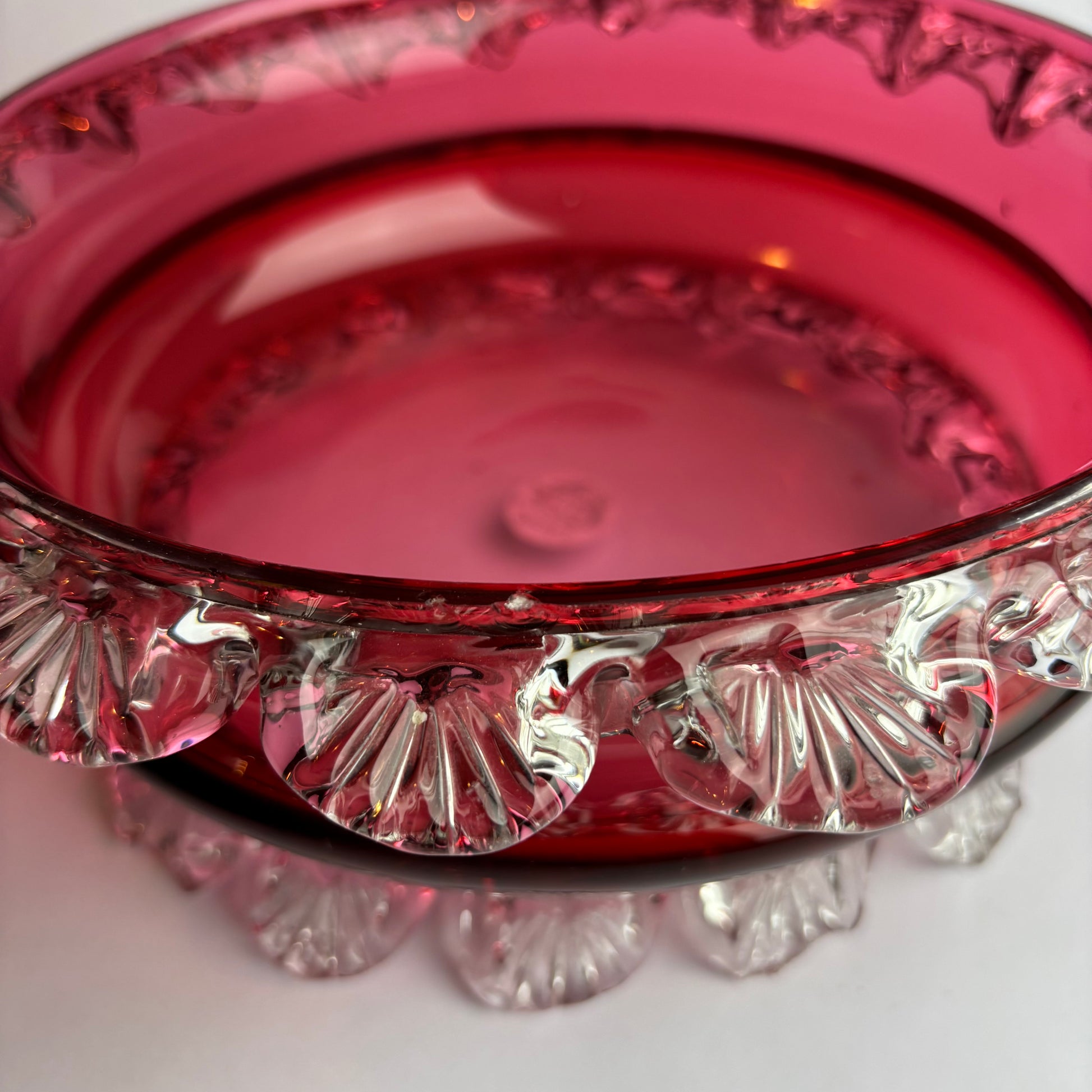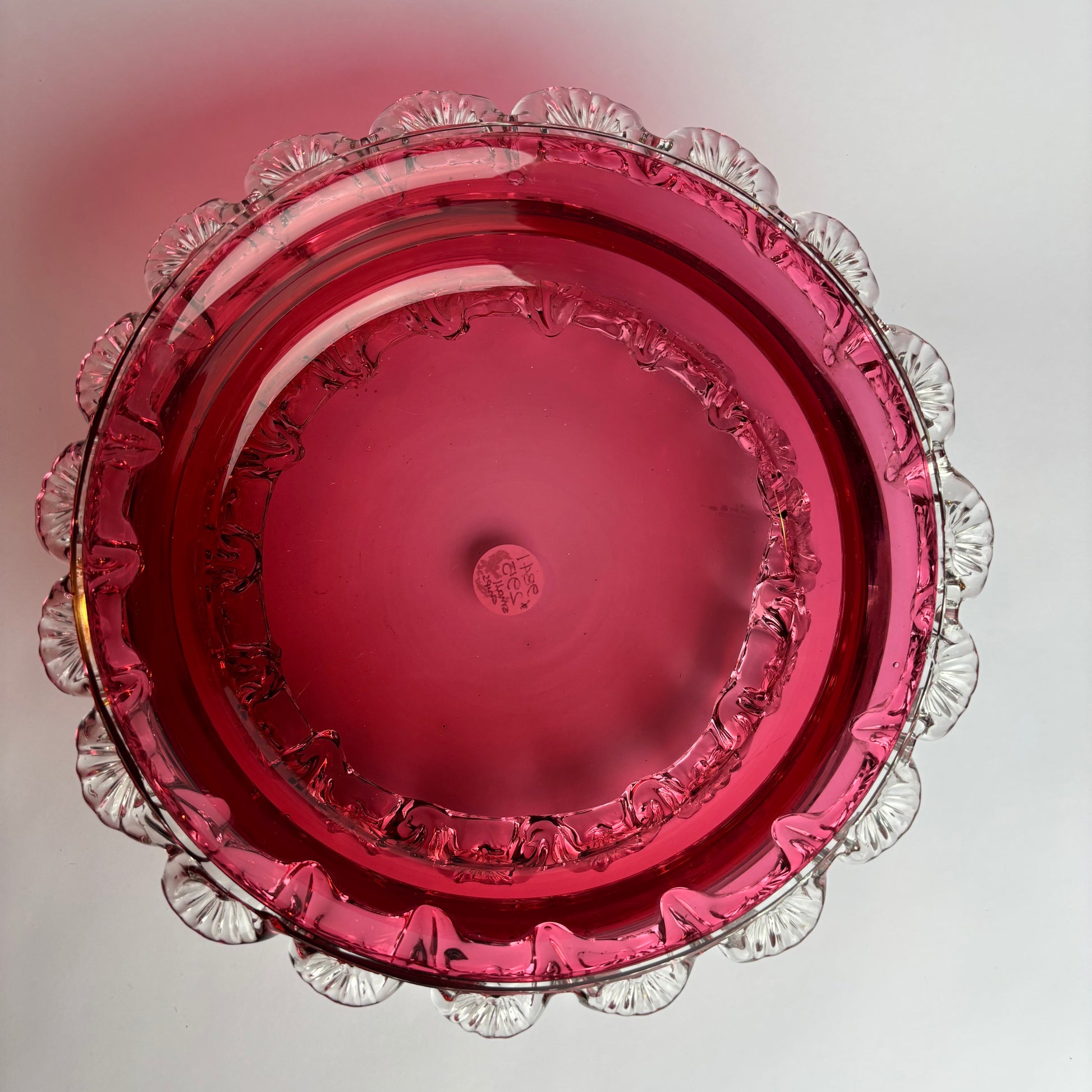 Material: Cranberry glass with applied clear prunts
