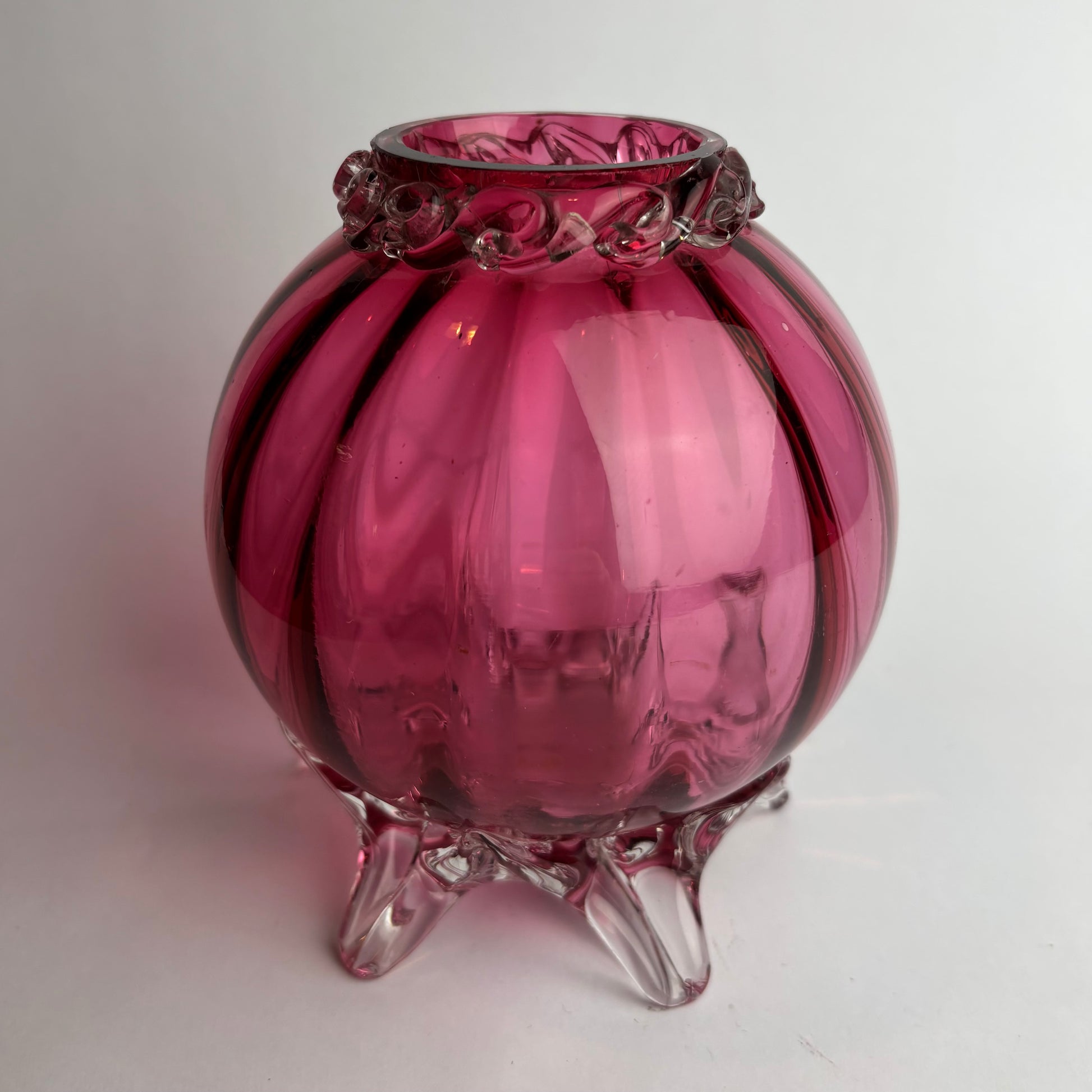 Striking late Victorian cranberry glass vase, hand blown with a bulbous ribbed body and finished with six applied clear glass feet. The rim is decorated with applied clear glass scrollwork, a classic decorative flourish of the period.