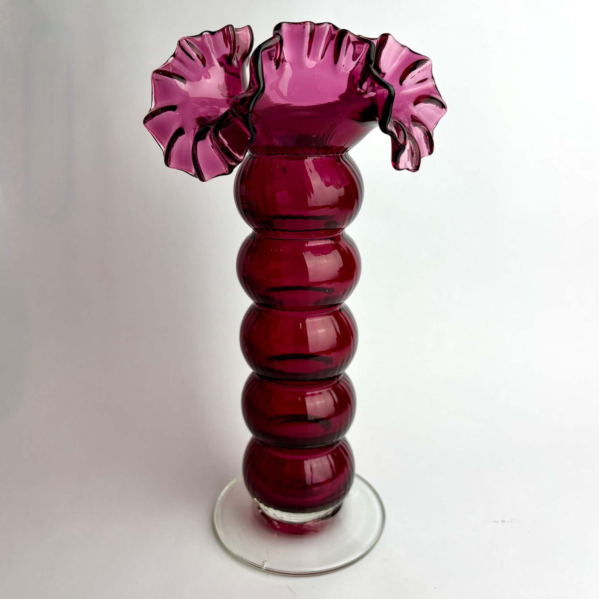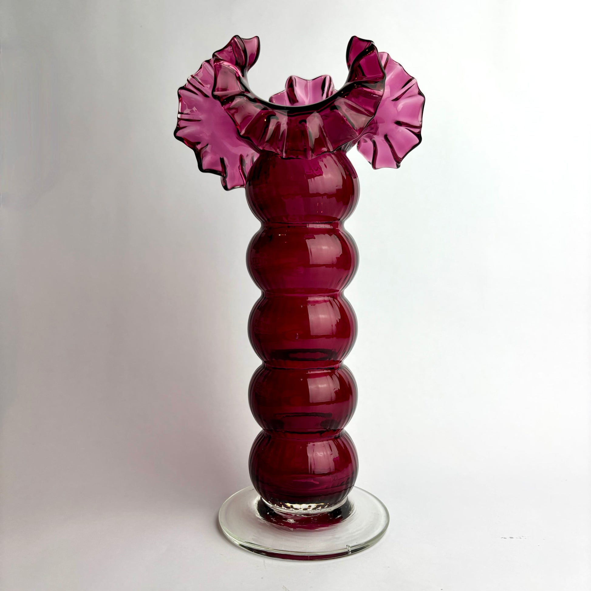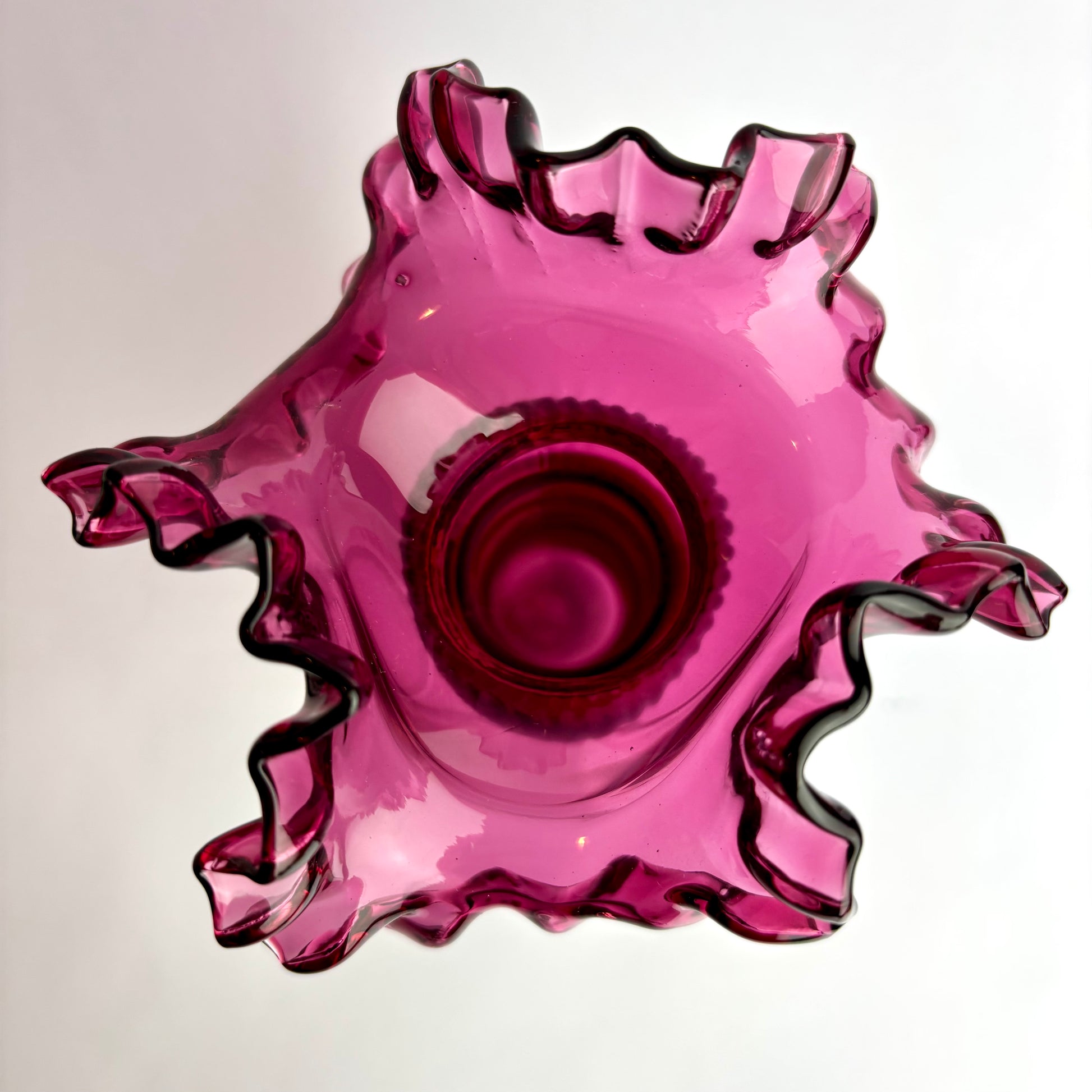 Cranberry glass was made using gold chloride, making it expensive and technically demanding to produce. Tall examples with bold ruffling and strong colour are increasingly scarce and highly collectible.