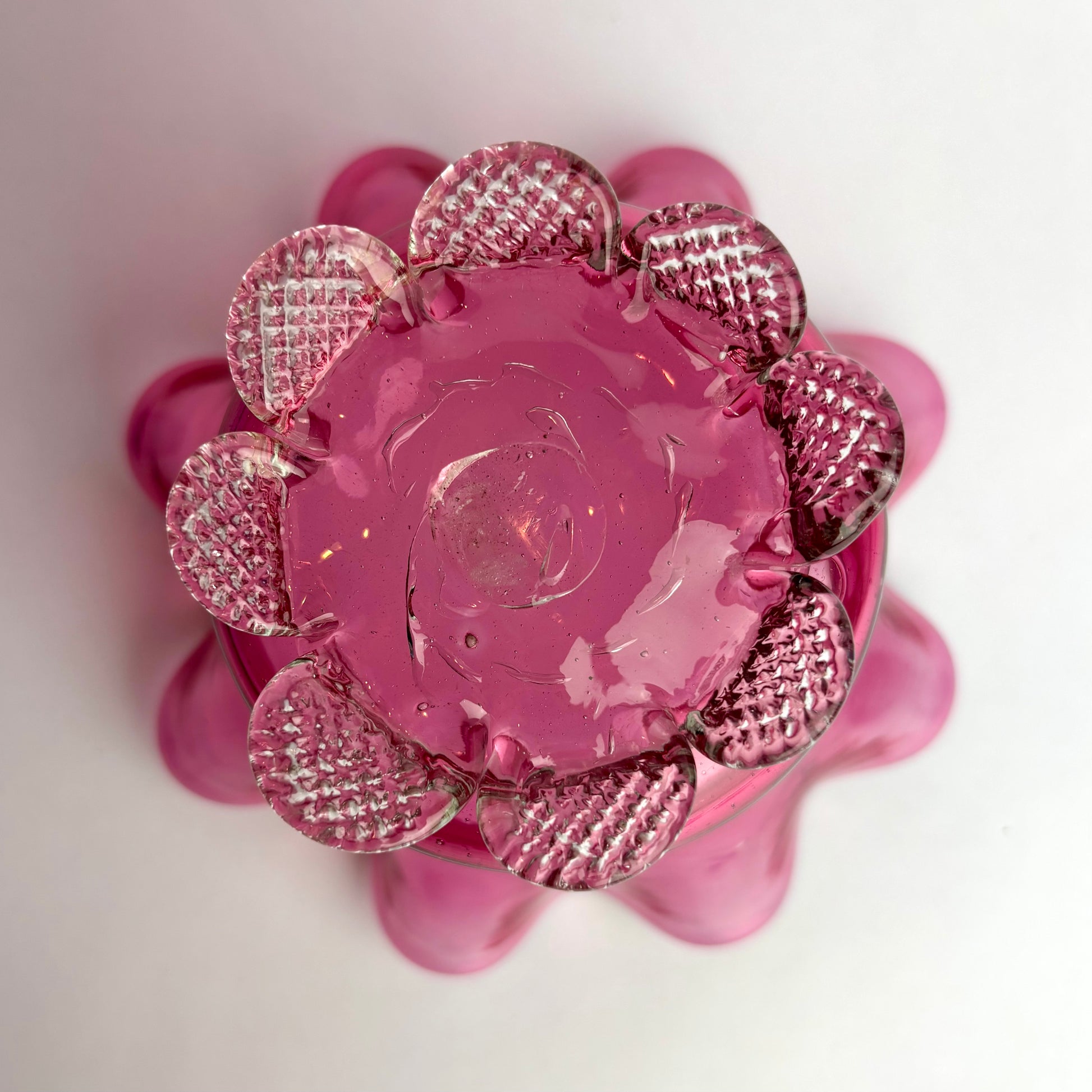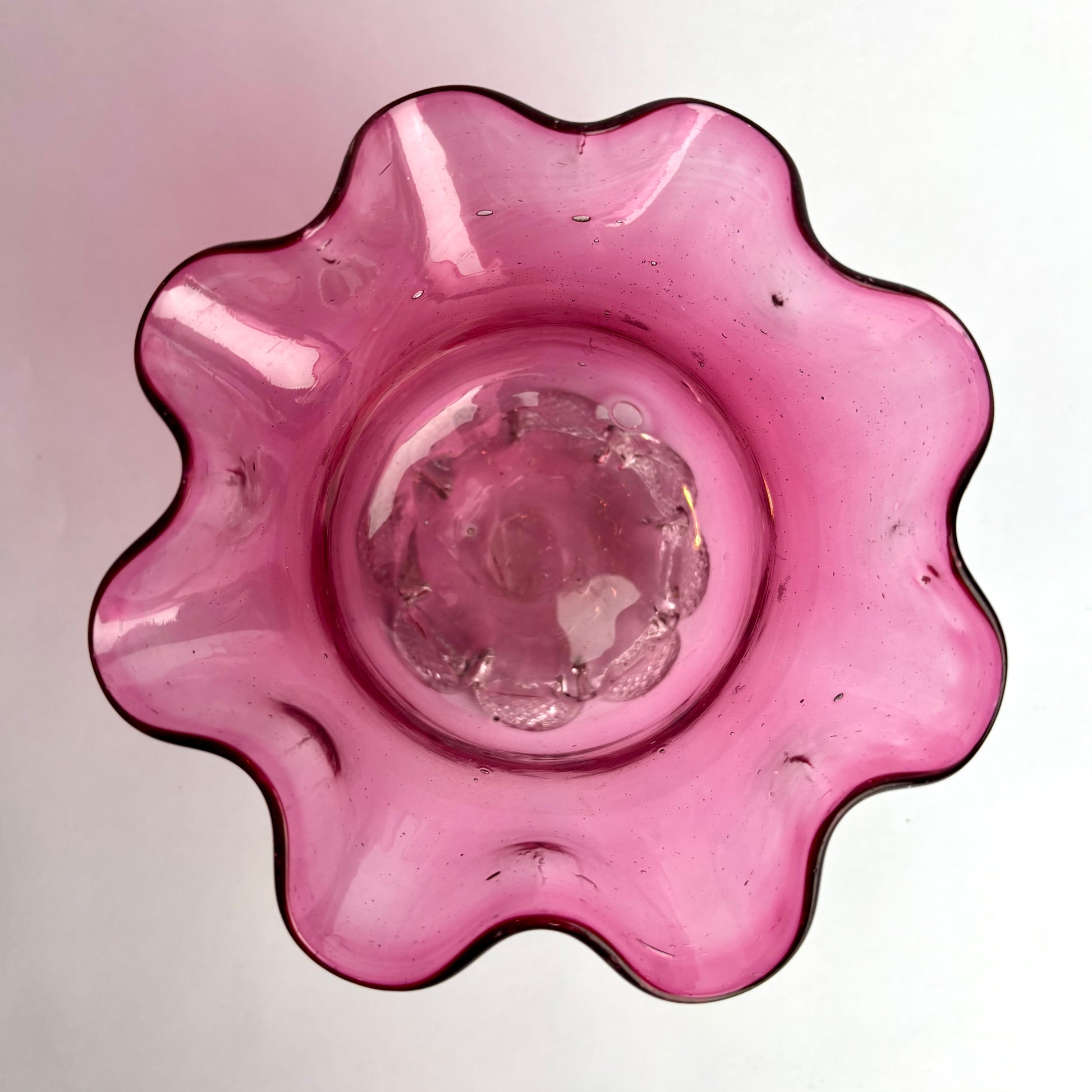 The base construction and applied feet are typical of late 19th-century English glassmaking and elevate this well beyond later decorative cranberry wares. Elegant as a stand-alone piece, or ideal for a single stem or small arrangement.