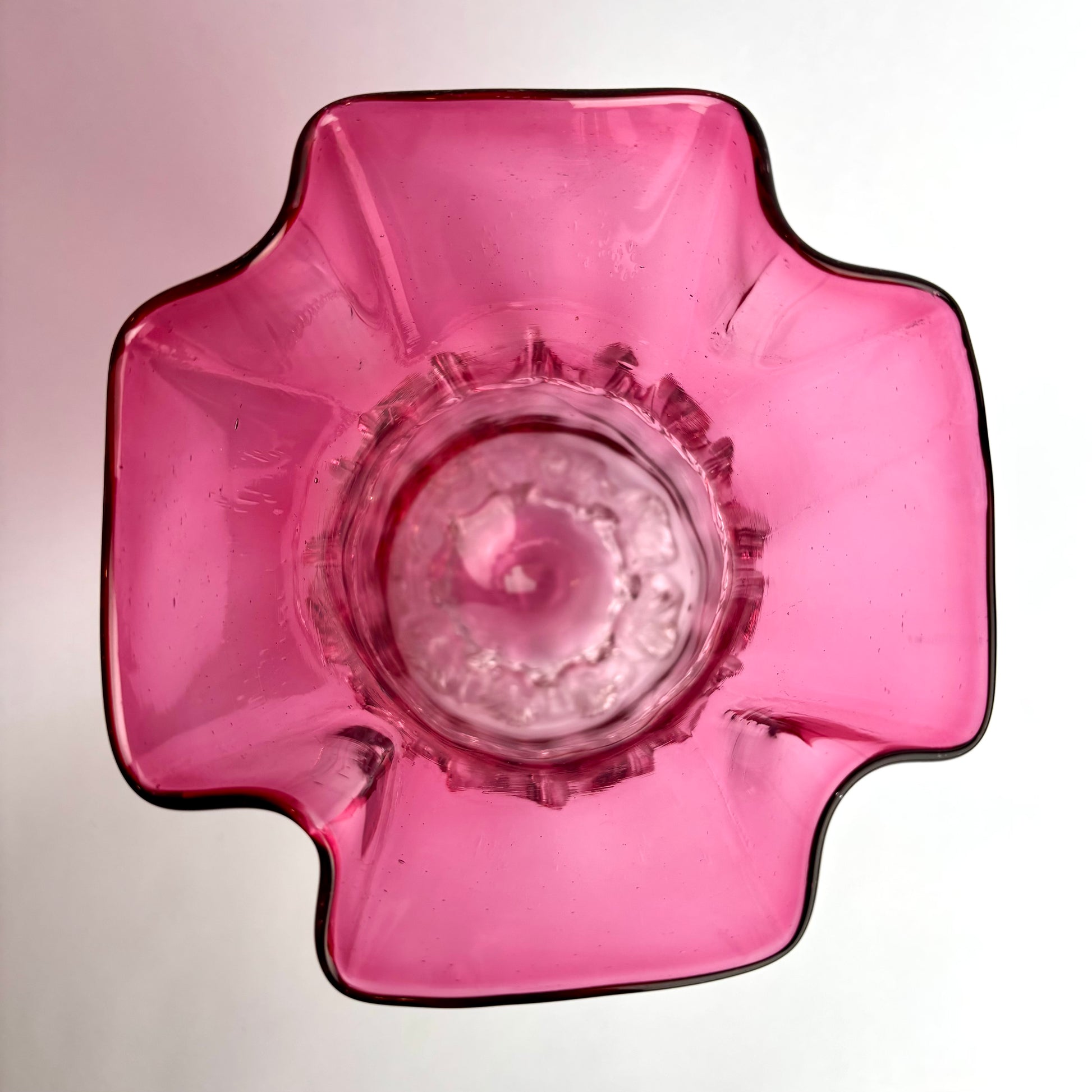 The cranberry colour is rich and even, with visible hand-working throughout and a polished pontil to the base. A classic decorative form from the late Victorian to Edwardian period, equally at home in a period interior or as a bold accent piece.