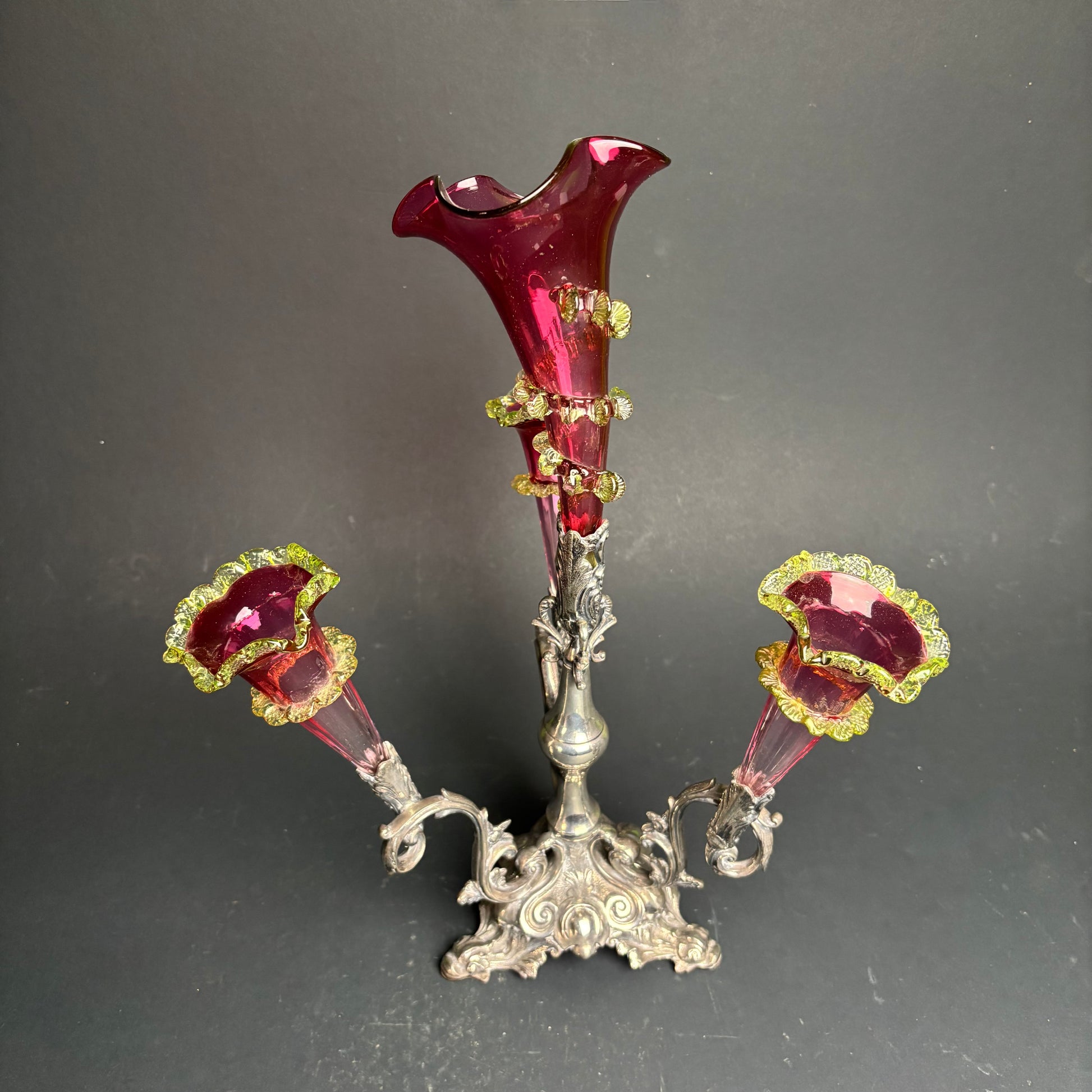 A striking Victorian epergne featuring four fluted cranberry glass trumpets with applied rigaree decoration and vivid uranium glass frilled rims.
