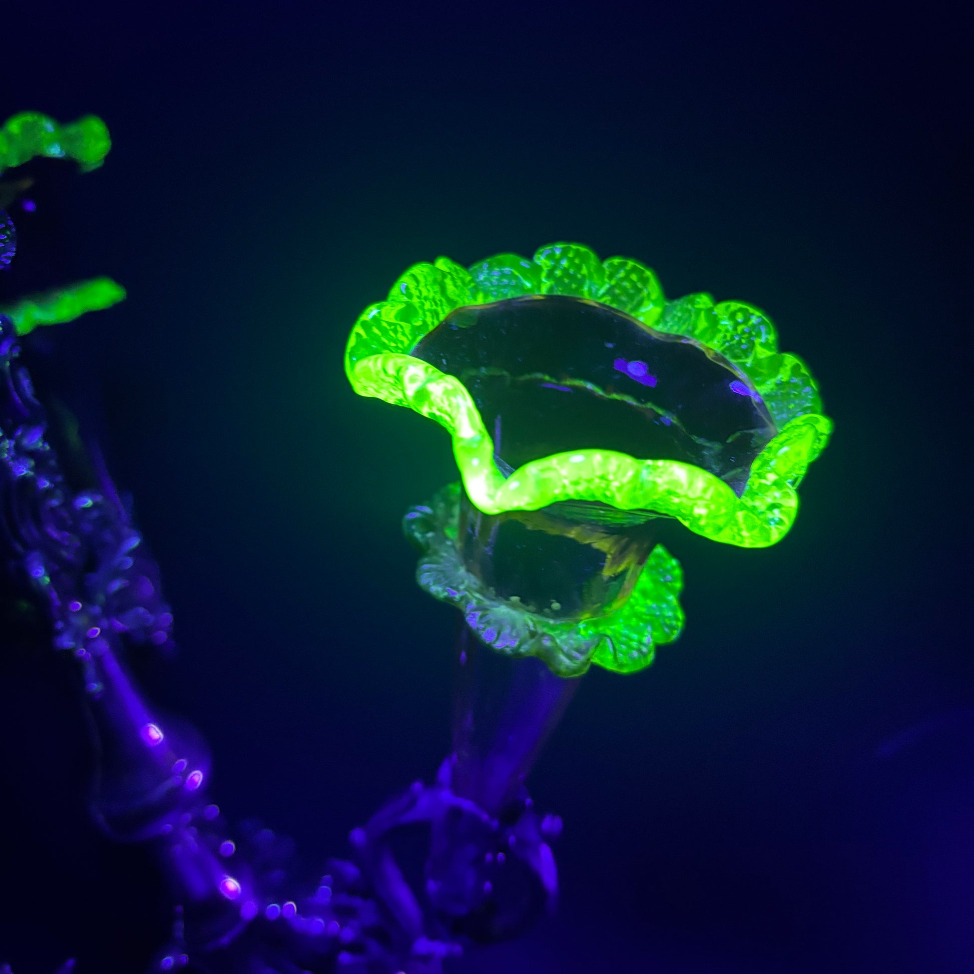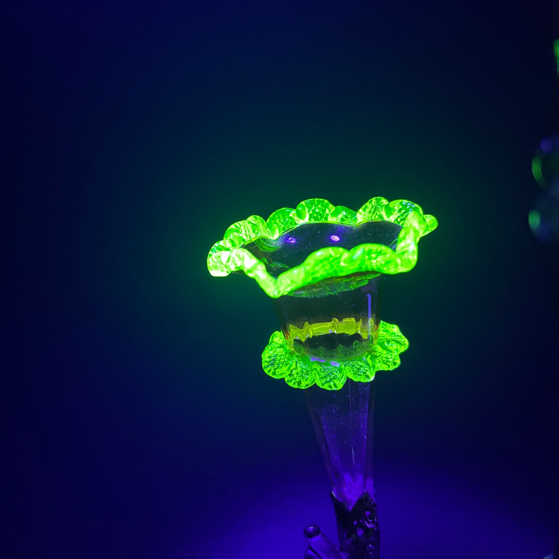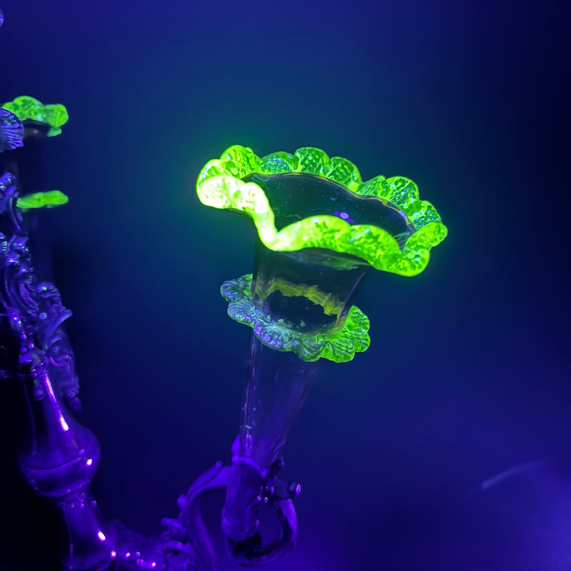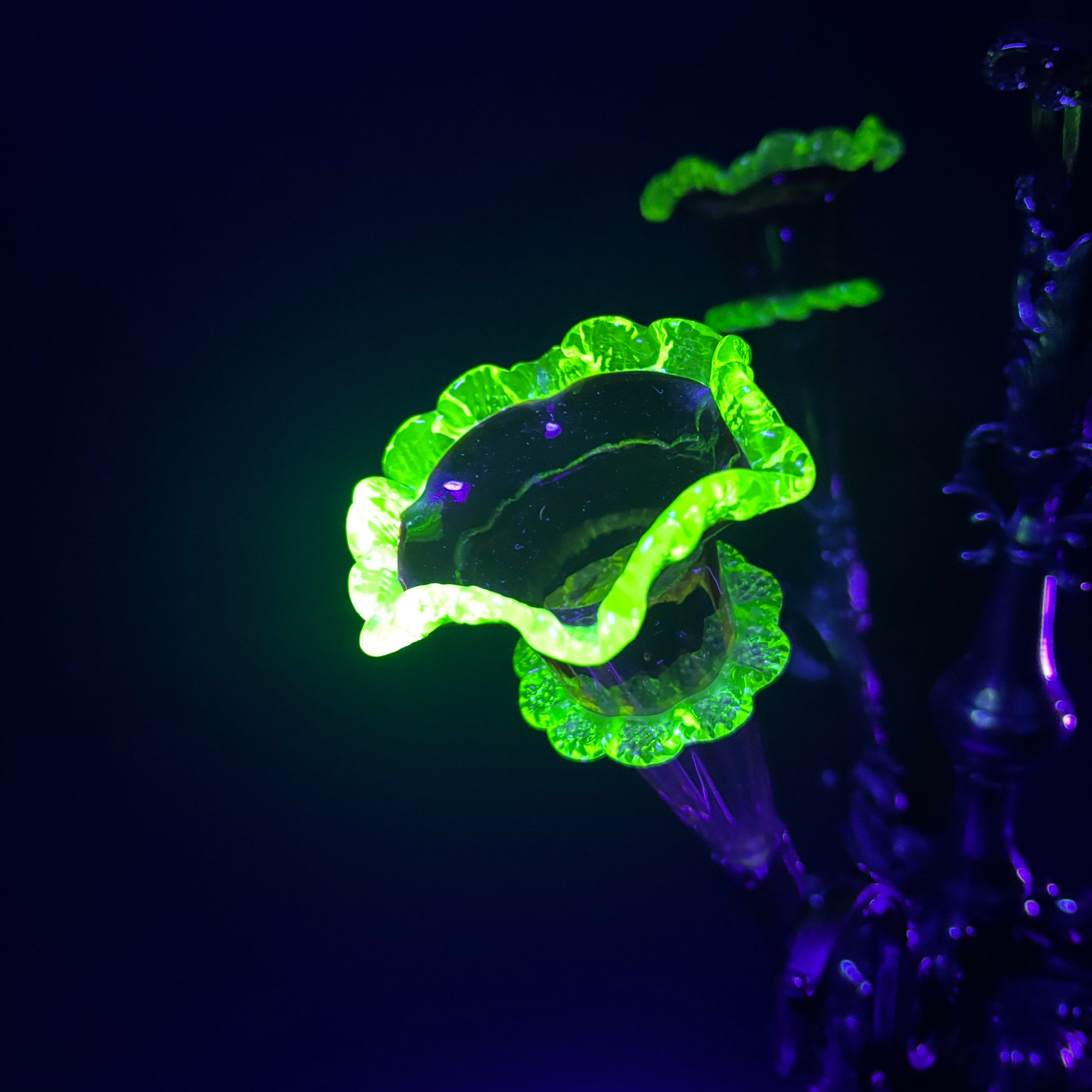 Under UV light the vaseline glass edges glow an intense electric green — a standout feature that elevates this beyond standard examples.