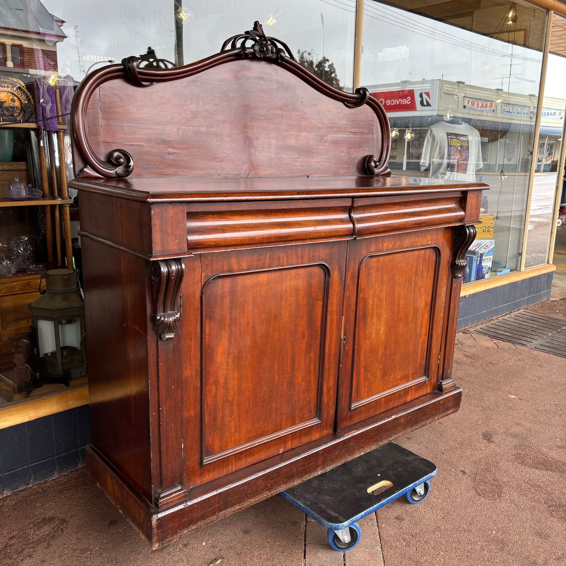 A well-proportioned Victorian chiffonier in richly figured mahogany, featuring a shaped back with carved foliate crest, twin frieze drawers, and a two-door cupboard base. The front is articulated with applied scroll brackets and raised panel doors, sitting on a plinth base.