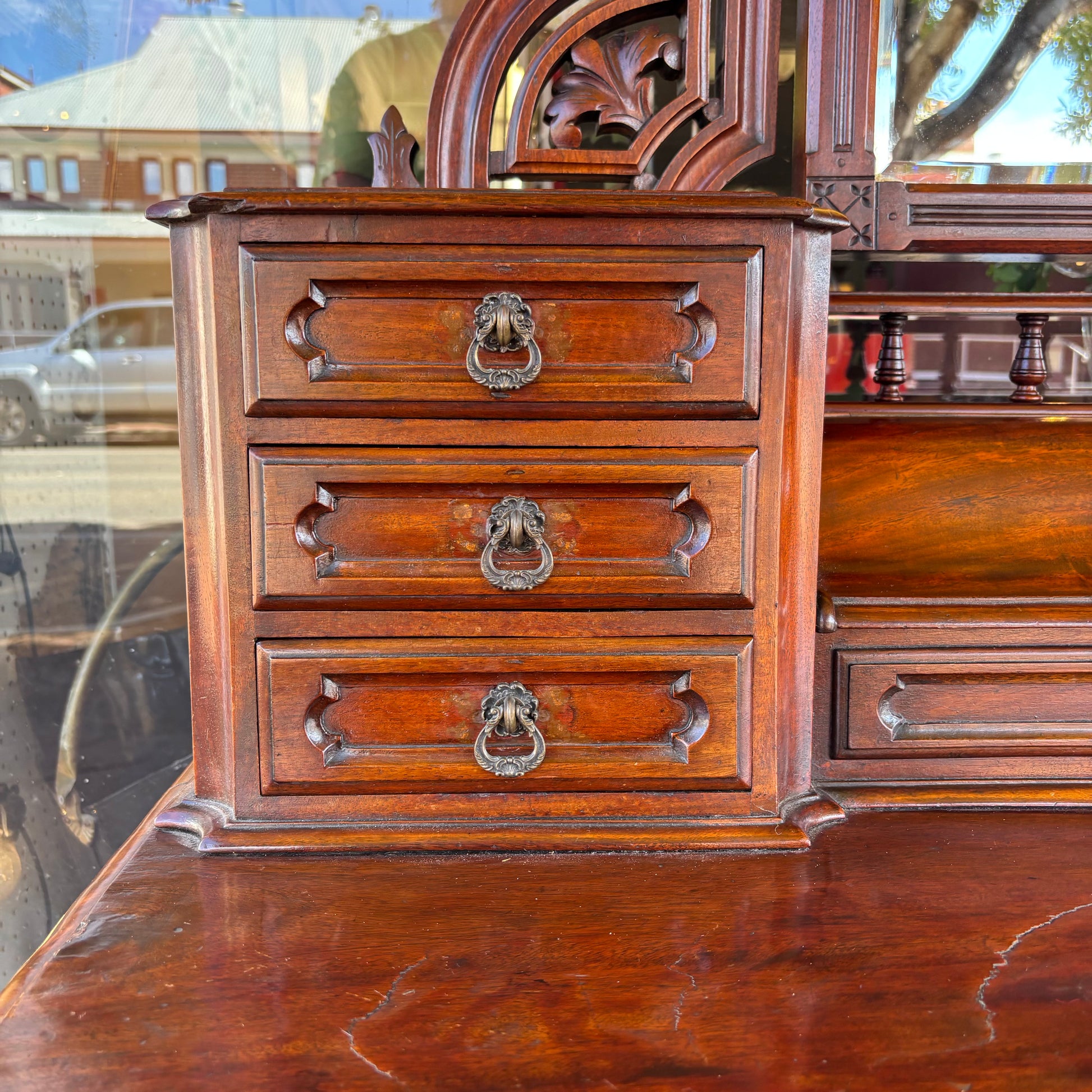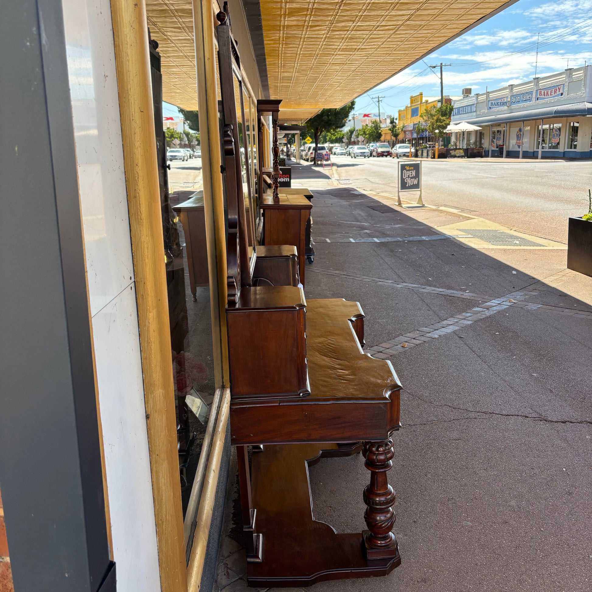 This is a classic example of Victorian bedroom furniture — rich mahogany tones, decorative carving, turned supports, and practical storage. The large central mirror is framed by carved supports and can be adjusted, while the base offers multiple drawers for everyday use.