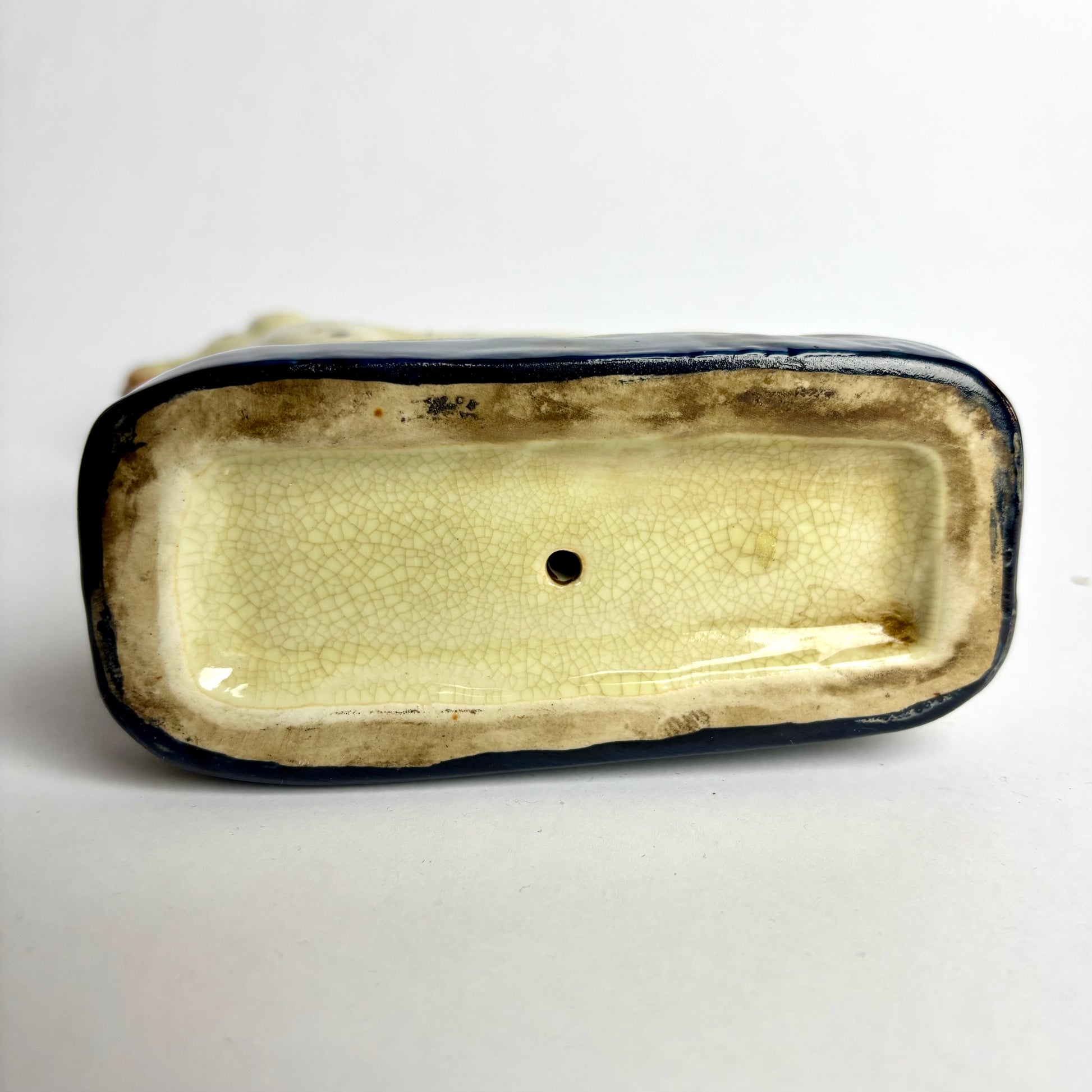 Unlike later revival examples, this piece shows the classic features of period Staffordshire production — a slightly irregular, hand-modelled form, underglaze painting, and a simple flat base with vent hole typical of 19th-century firing methods. The naturalistic base and integral support reflect the practical construction used by Staffordshire potteries to stabilise taller figures during firing.