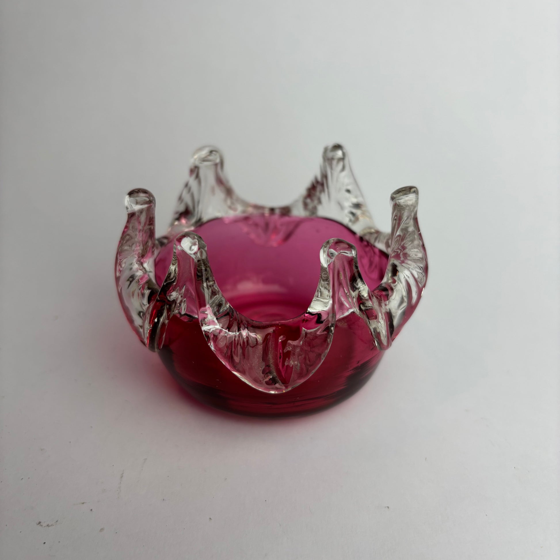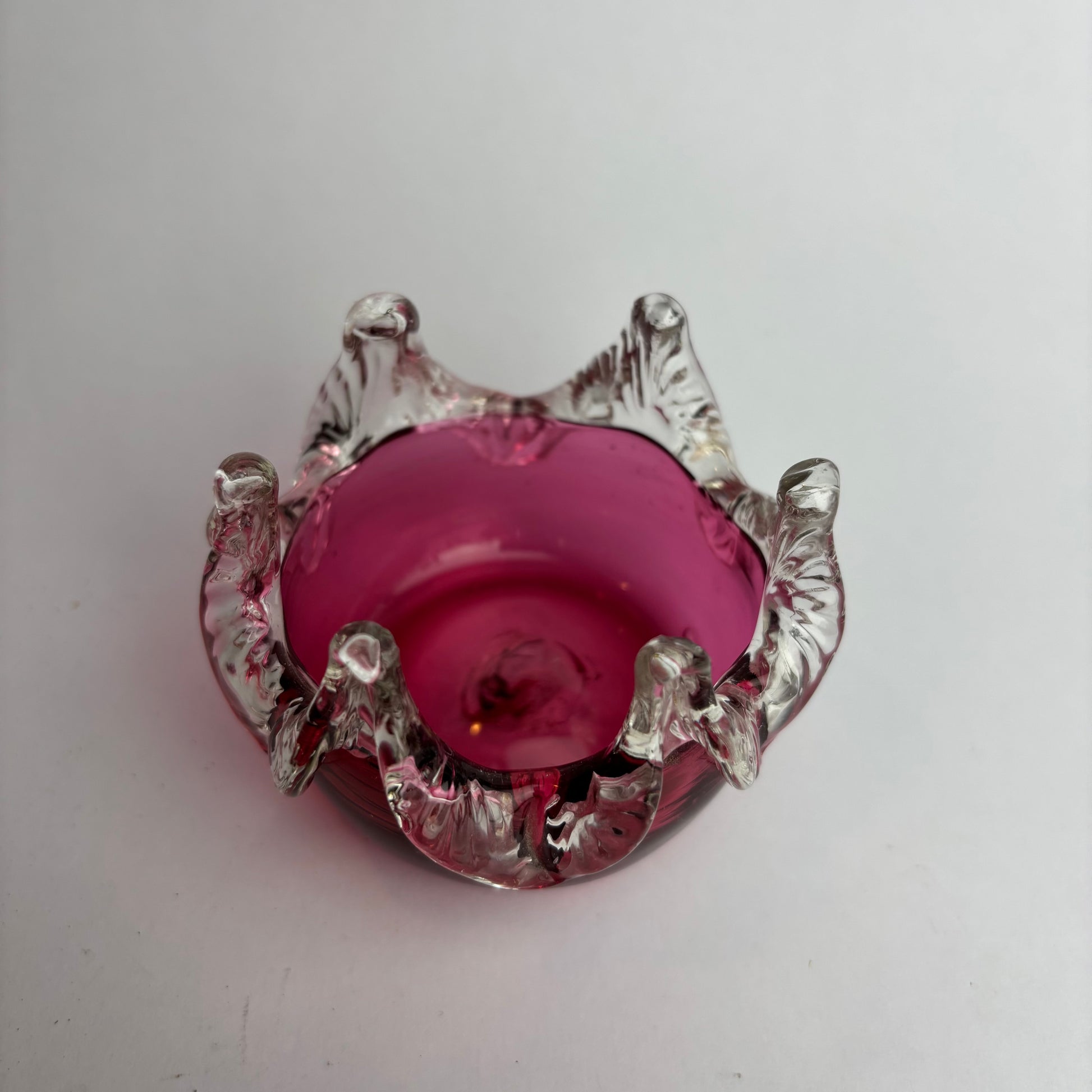 A richly coloured cranberry glass bowl in Victorian style, featuring an expressive clear crown-rim formed with applied pulls. The piece has excellent colour saturation and visible hand-worked character, including a polished pontil to the base.