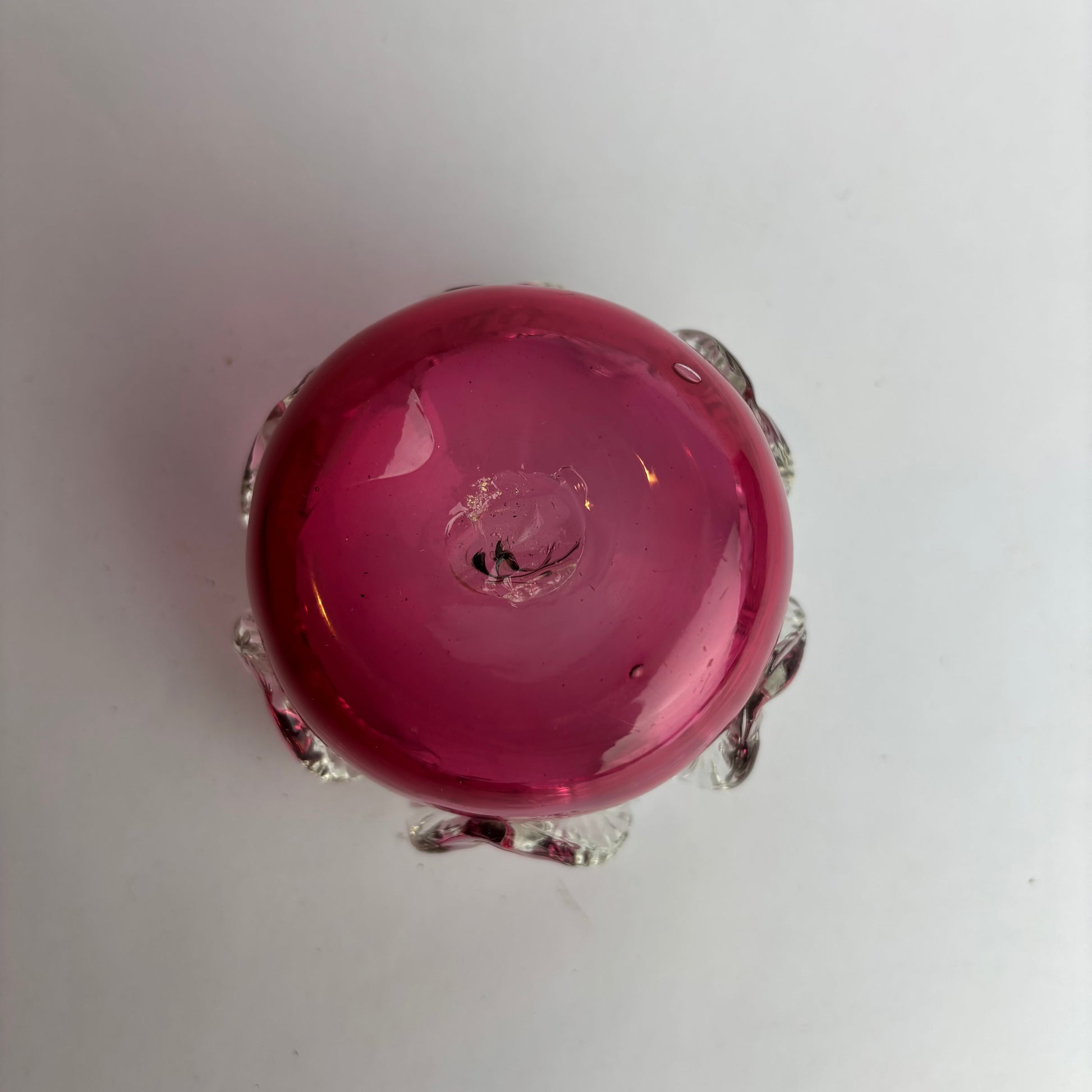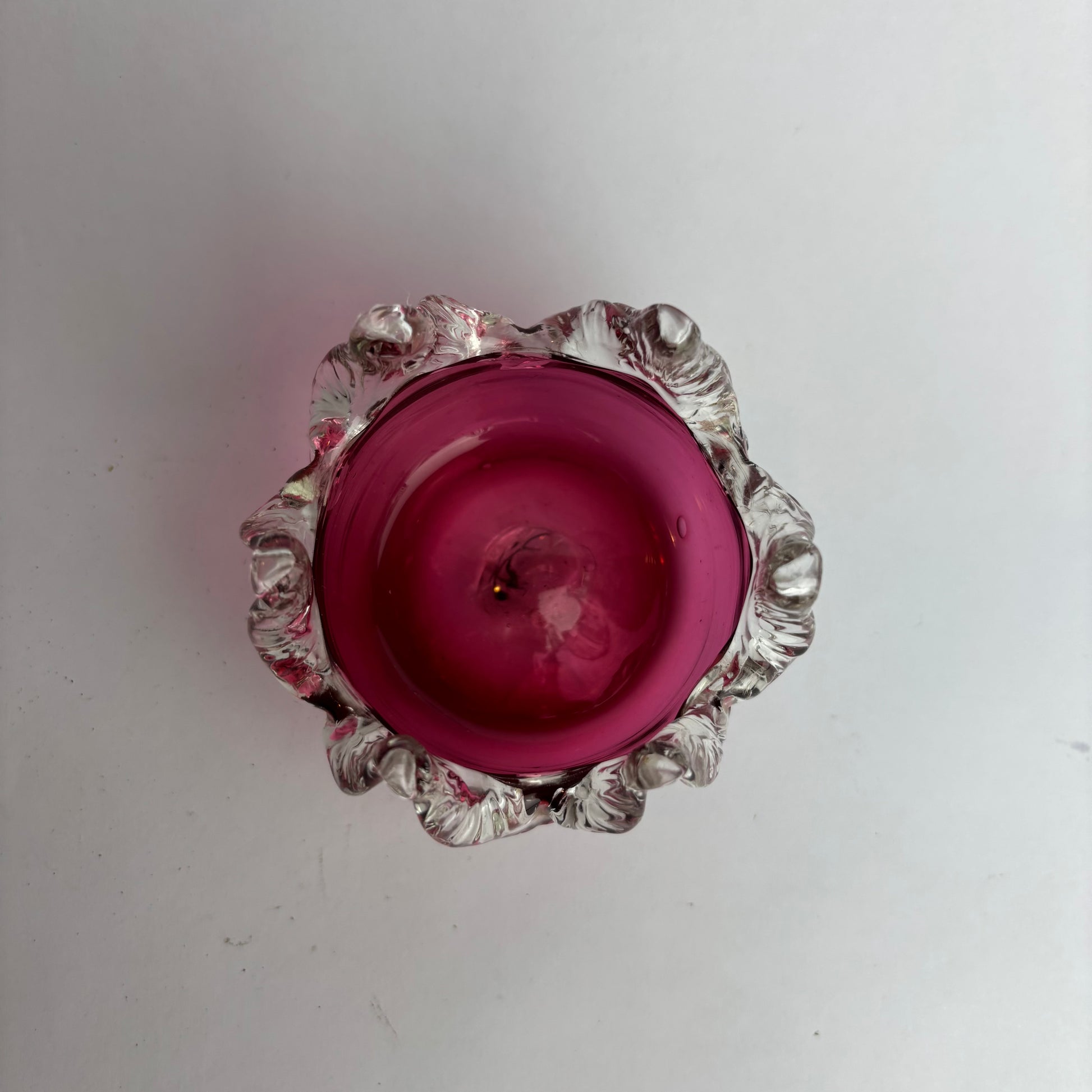 While inspired by 19th-century cranberry glass forms, this example dates to the mid-20th century, made as a decorative art glass interpretation of Victorian design.
